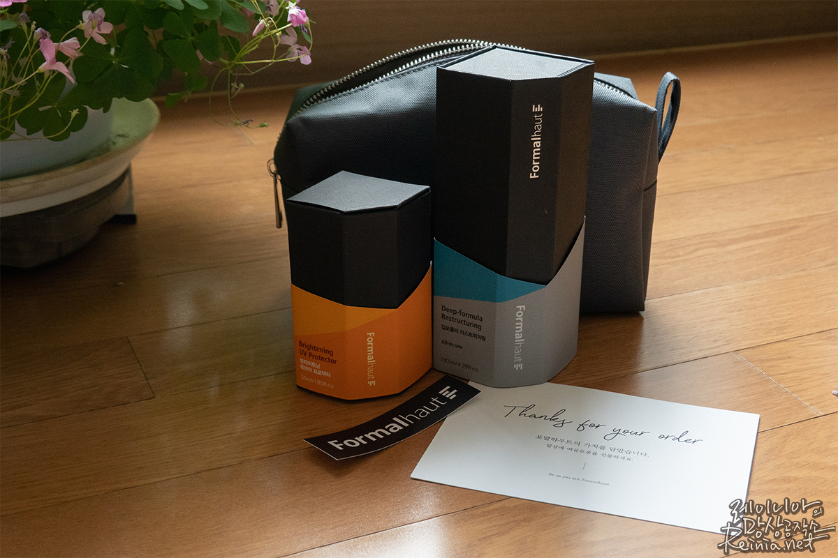 제가 받은 건 두 개의 제품입니다. 딥포뮬러리스트럭처링 올인원, 그리고 브라이트닝유브이프로텍터, 덤으로 이를 담을 수 있는 다용도 파우치까지요. 택배로 온 선물을 열자마자 작은 카드가 보였는데, 이런 세심한 부분에서 소비자를 신경 쓴다는 느낌을 받았습니다.