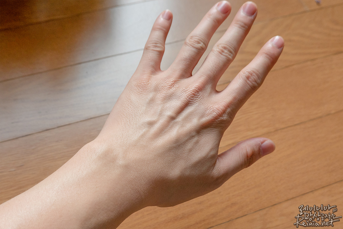 사진으로 보니 좀 덜한 감은 있지만, 확실히 정돈된 느낌입니다. 손등만 묘하게 뽀야네요. 기분이 묘했습니다. 마찬가지로 꾸준히 바르면 로즈마리잎 추출물, 라벤더잎 추출물로 미백과 주름 개선 효과를 기대할 수 있으며, 트리플히알루론산, 대나무수, 카렌듈라꽃추출물과 같은 보습 성분으로 보습까지 기대해봄 직합니다.
