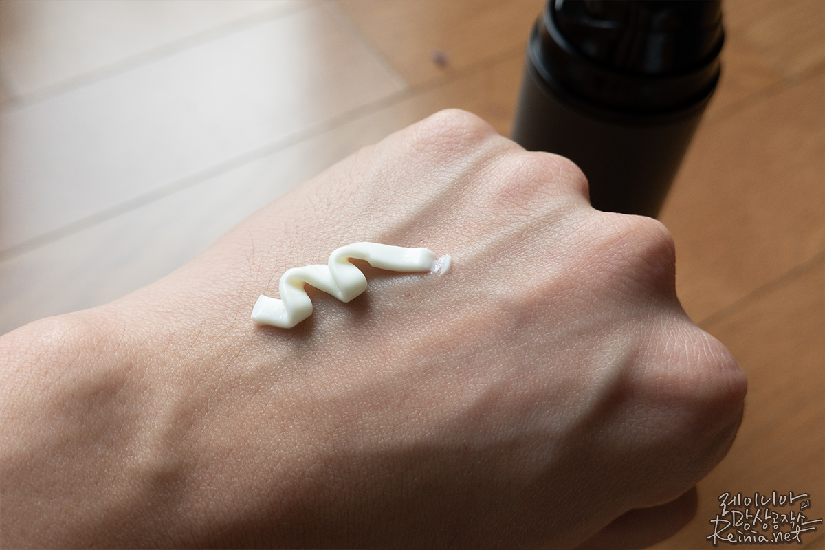좀 느긋하게 짜낸 1회 펌핑인데요. 크림타입이라 저는 이 정도도 살짝 많은 느낌을 받았어요. 살살 펴 바르고 톡톡 두드려 흡수를 마무리했습니다. 조금 놀랐던 건 생각보다 흡수력이 뛰어나다는 점이었어요. 펴 바르는 순간 뻑뻑함보다 촉촉한 물기가 살아있더라고요. 물이 배어 나오는 느낌이랄까요?