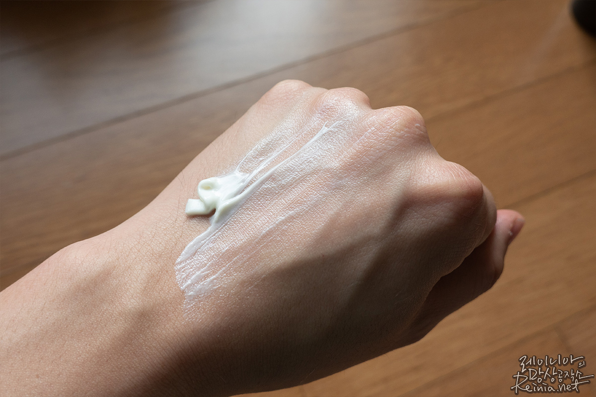 마찬가지로 손등에 펌핑해봤는데요. 크림 타입의 제형인데, 크림 속에 알갱이 같은 게 촘촘하게 있더라고요. 이게 뭔가 싶어서 손등에 살살 발라봤습니다.