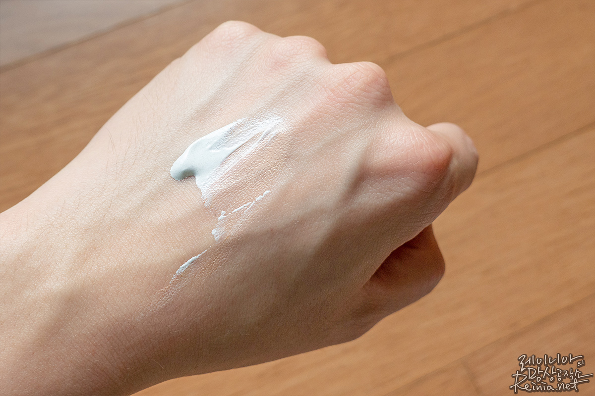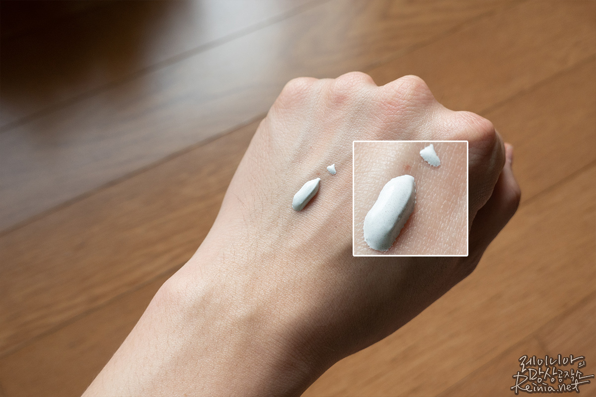 마찬가지로 손등에 펌핑해봤는데요. 크림 타입의 제형인데, 크림 속에 알갱이 같은 게 촘촘하게 있더라고요. 이게 뭔가 싶어서 손등에 살살 발라봤습니다.
