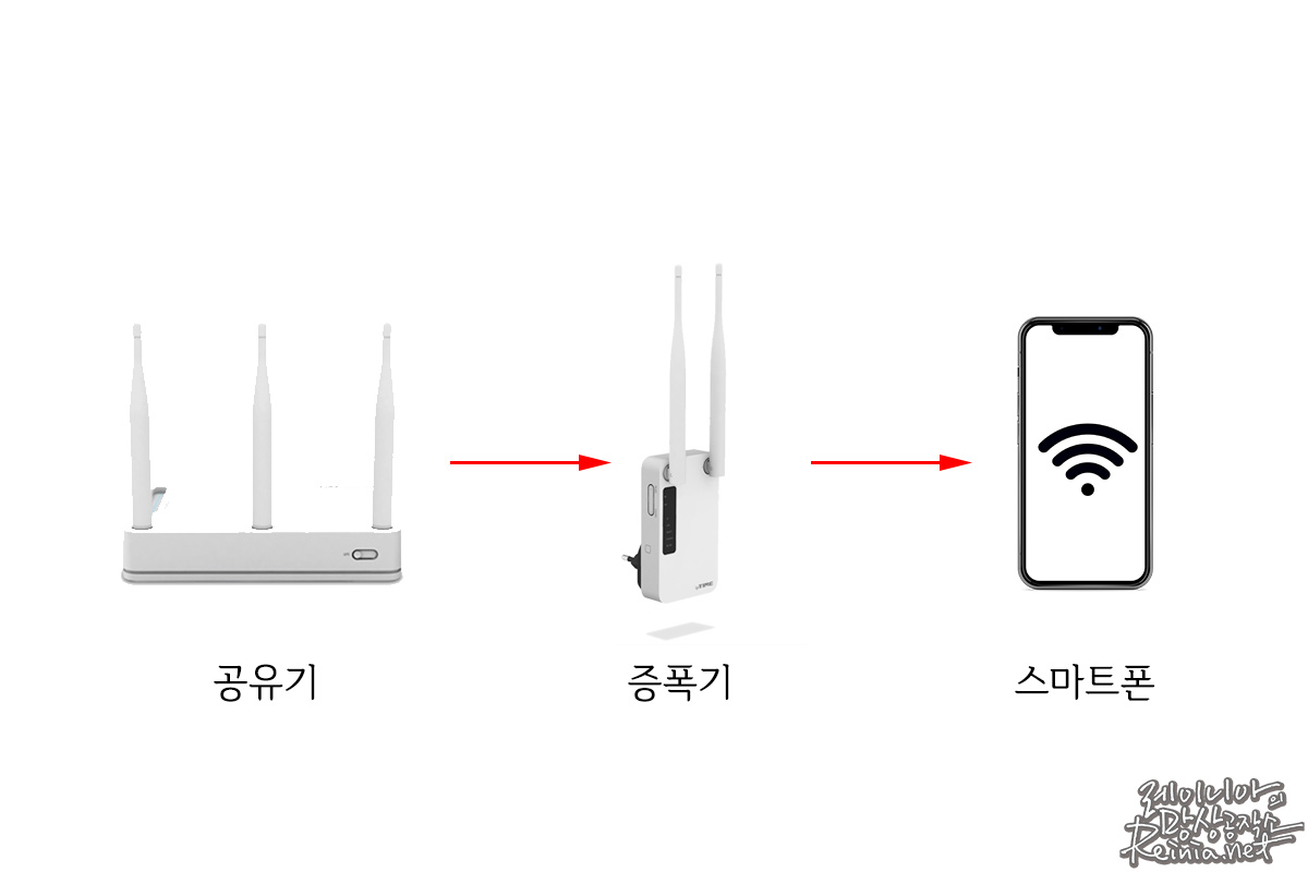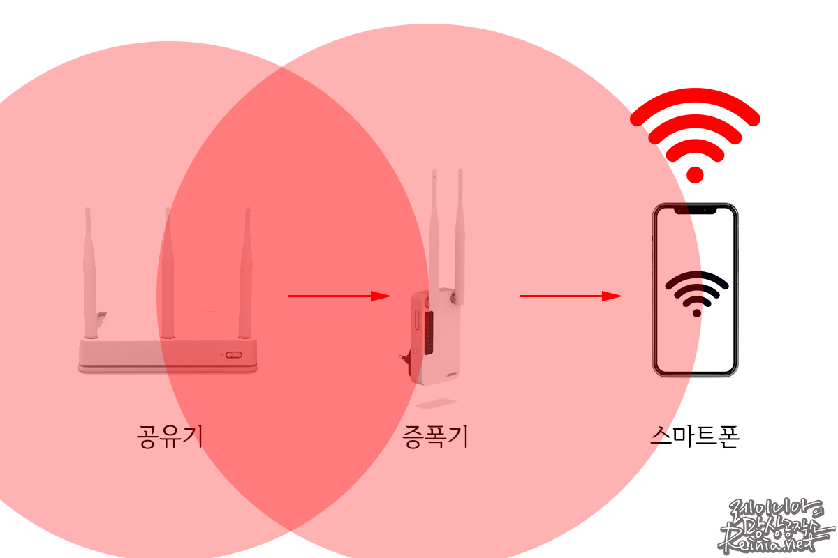 와이파이 증폭기, 와이파이 확장기, 인터넷 증폭기, 공유기 증폭기... 명칭은 다양하지만, 결과적으로 하는 일은 단순합니다. 공유기의 신호를 받아 이를 다시 확산해 주는 거죠. 세기를 증폭하는 데도 도움이 되고 범위를 넓히는 데도 도움이 됩니다.