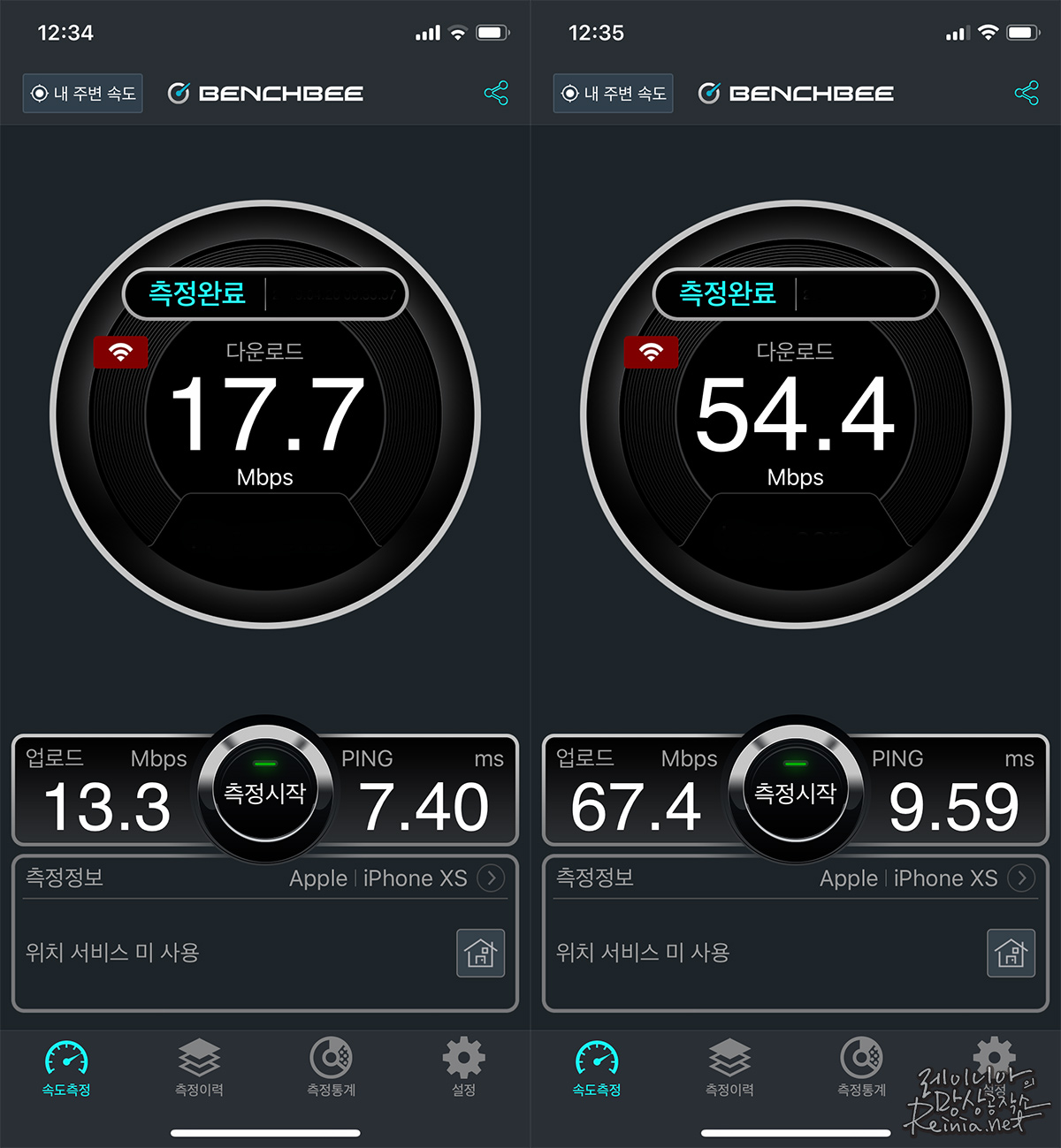 안테나 두 칸이었던 곳에선 고작 17.7Mbps였던 인터넷 속도가 와이파이확장기를 연결한 후에는 54.4Mbps까지 뛰어올랐습니다. 생각했던 것보다 더 괜찮은 효과를 보여주네요.