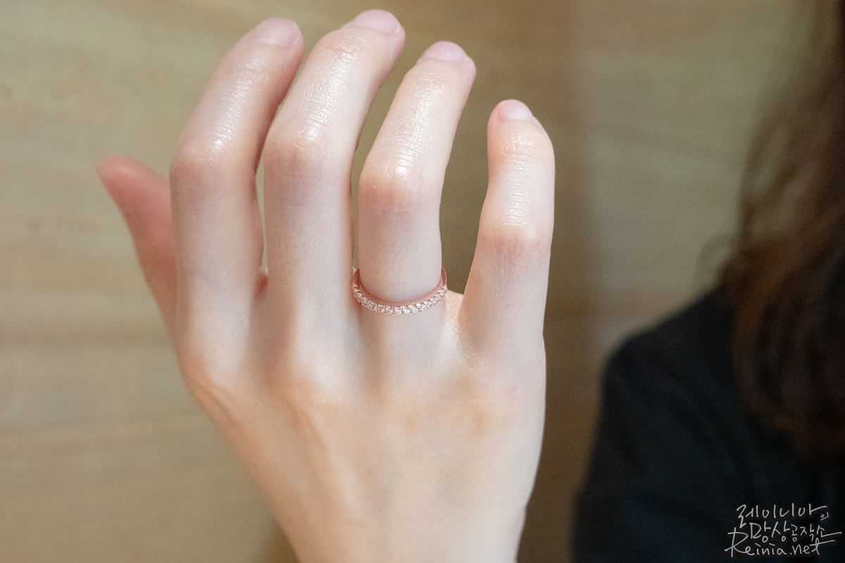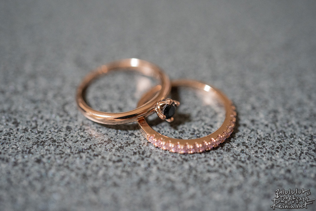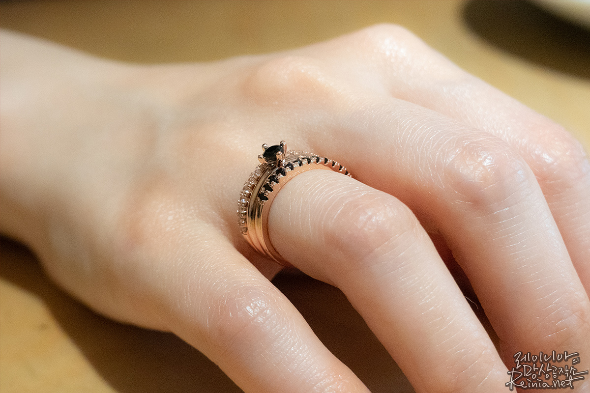 프리다 링은 스톤이 전면에 나서는 모양입니다. 그 자체로 깔끔한 느낌이 있습니다만, 조금 심심하다 싶으면 앞서 본 에바 링 등을 함께 착용해줘도 좋습니다. 에바 블랙 로즈 골드 링이 잘 어울리네요.