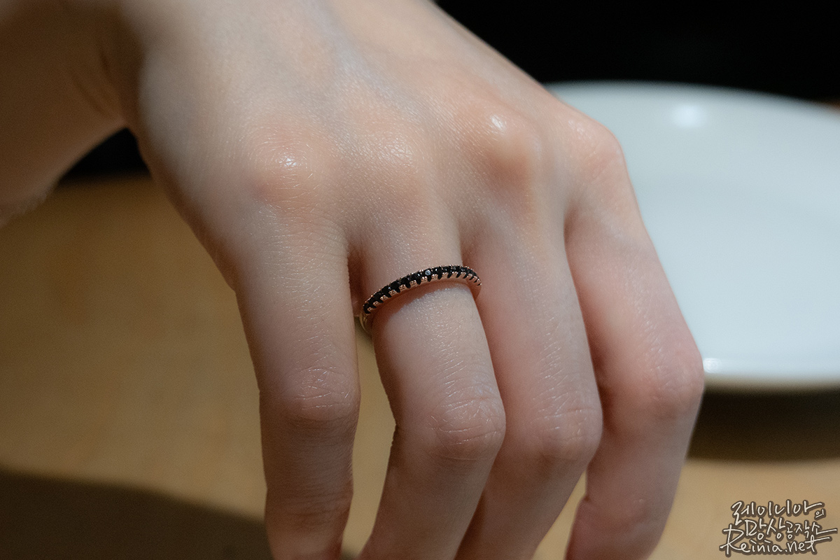 스톤이 검은색이라서 너무 탁해 보이거나 혹은 저렴해 보이지 않을까 걱정했습니다만, 실제로 제품을 받아보니 그런 느낌보다는 심플하고 세련된 느낌이 강했습니다. 화이트는 화사한 느낌이 있고요. 가드링을 고려했을 때, 어떤 반지와 함께 끼는지에 따라 스톤 색을 고르면 되겠습니다. 저는 바꿔가면서 끼도록 두 가지 상반된 색을 모두 선택했습니다.