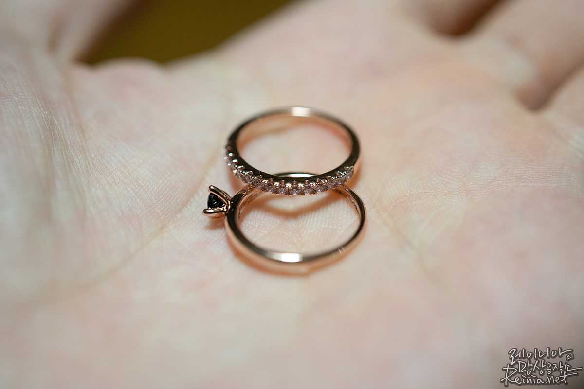 기본적으로 은재질(925 스털링 실버)에 금도금(14K)을 했습니다. 안에 박힌 스톤은 AAA 큐빅 지르코니아고요. 스톤의 색상에 따라서, 그리고 도금 색상에 따라서 종류가 많습니다. 저는 에바 화이트 로즈 골드, 에바 블랙 로즈 골드를 선택했습니다.
