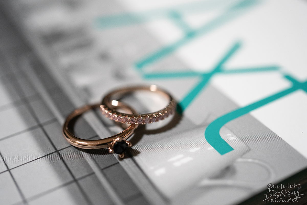 프리다 링은 스톤이 전면에 나서는 모양입니다. 그 자체로 깔끔한 느낌이 있습니다만, 조금 심심하다 싶으면 앞서 본 에바 링 등을 함께 착용해줘도 좋습니다. 에바 블랙 로즈 골드 링이 잘 어울리네요.