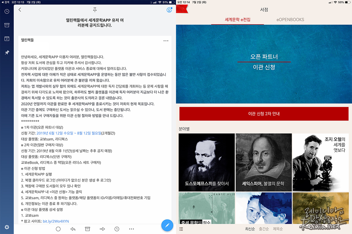 굳이 덧붙이지 않아도 열린책들은 이번 사태로 수많은 코어 이용자들의 신뢰를 잃었습니다. 당장 저도 서점에 꽂힌 열린책들의 책을 보면서 선뜻 손이 가지 않는데요. 이건 자업자득이니 안타까운 마음이 들거나 하진 않습니다. 다만 전자책 시장에서 출판사 주도의 플랫폼이 하나 확실하게 사라지게 됐다는 점. 그리고 이게 여러 사람에게 상처를 주면서 사라지게 됐다는 게 안타깝습니다.