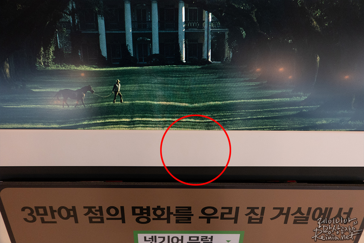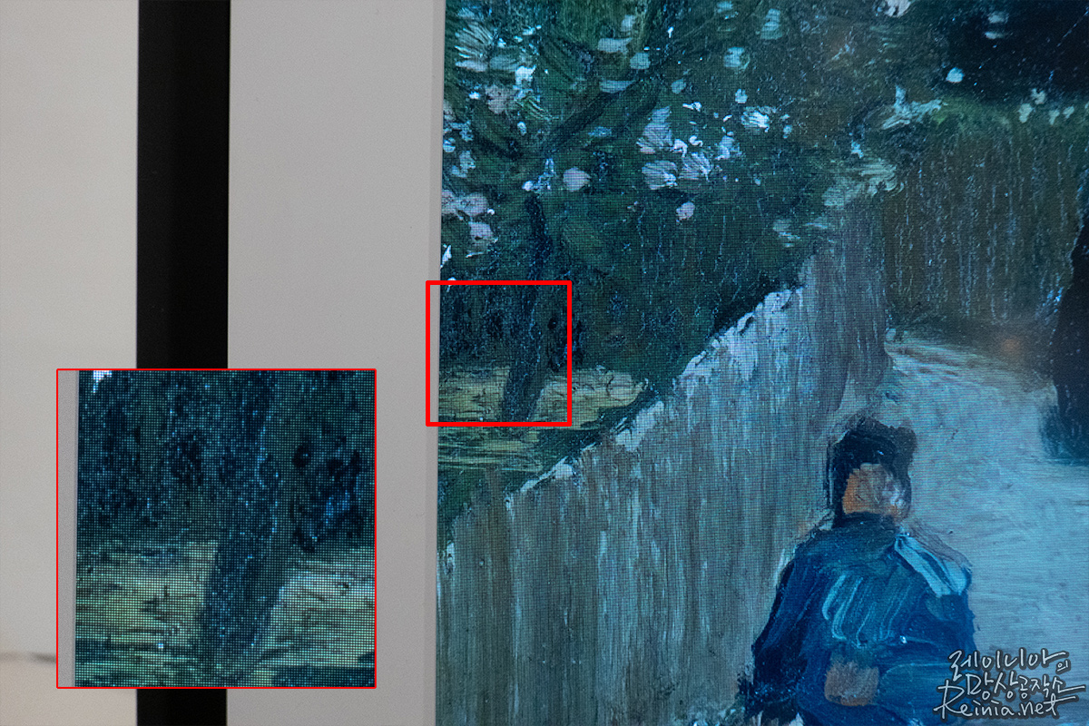 반사가 적은 것도 특징인데요. 반사가 생겨서 자칫 그림의 색상을 왜곡할까봐 걱정했는데, 이런 걱정도 기우였습니다. 뮤럴 캔버스2를 소개한 넷기어코리아에 따르면 '눈부심 방지 매트 스크린'을 채택해 그림 본래의 색감을 완벽하게 구현해 낼 수 있다고 하네요.