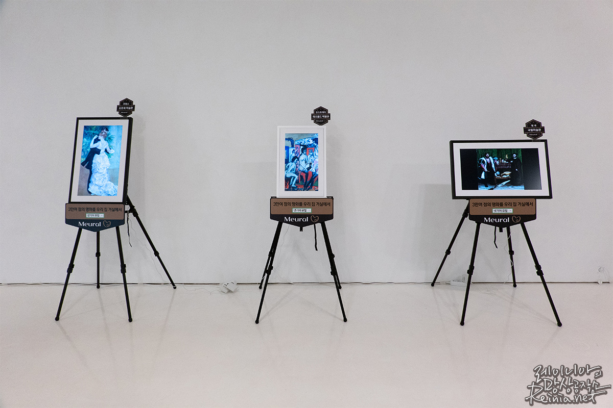 뮤럴 캔버스는 FHD급 디스플레이를 탑재한 디지털 캔버스입니다. 벽에 부착하거나 별도의 액세서리를 통해 세워서 전시할 수 있는데요. 여기에는 그림 혹은 사진을 띄워 인테리어 소품으로 삼을 수 있습니다.