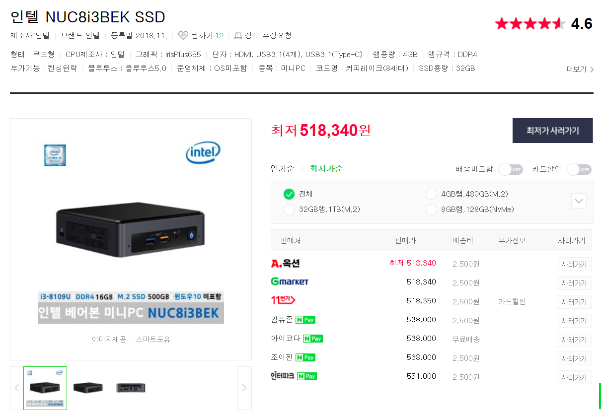 NUC Kits 카카오 에디션 NUC8i3BEH SSD Win10Pro - 옥션