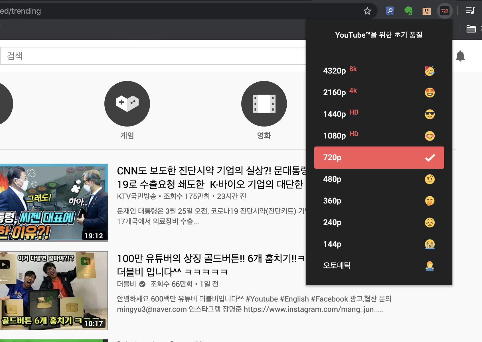 사용 방법은 간단합니다. 설치한 후 크롬 메뉴에서 확장 프로그램을 켜고 원하는 화질을 설정하면 됩니다.