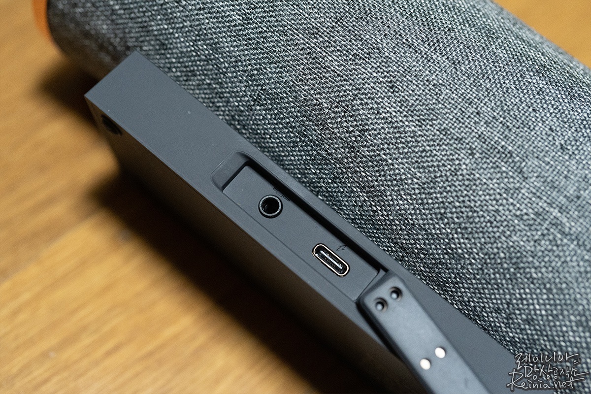 집에 놓기에 좋은 디자인이지만, 외부로 들고 나갈 일을 대비한 점도 인상적입니다. '생활 방수'를 지원하는 IPX6 방수등급을 갖춰 외부에서도 큰 문제 없이 쓸 수 있습니다. 675g이라는 가벼운 무게, USB-C 케이블로 한 번 충전하면 최대 14시간을 재생할 수 있는 배터리 성능 또한 외부에서 유용하게 쓸 수 있는 이유입니다.