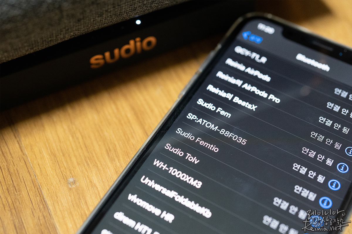 블루투스 설정에서 Sudio Femtio를 선택하면 연결음과 함께 LED가 녹색으로 점멸하기 시작합니다. 이제 펨티오를 통해 음악을 재생할 수 있습니다.