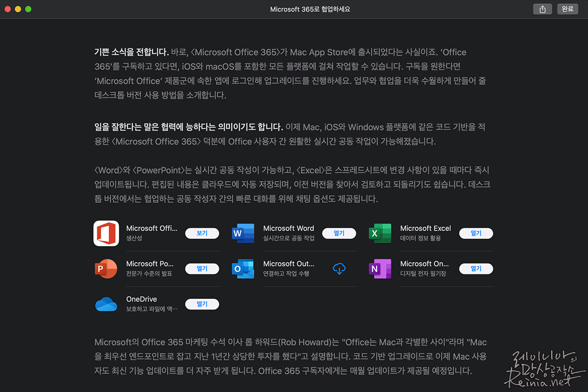 업무용으로 오피스 365를 쓰기에 원드라이브(OneDrive)를 포함해 상성은 좋습니다. 그리고 아웃룩을 주로 쓰고 있는데요. 메일 서버를 POP로 받아봤을 때는 pst파일이 10GB를 넘어가면서 허덕이긴 했지만, IMAP 방식으로 전환할 수 있게 되면서 많이 좋아졌습니다.