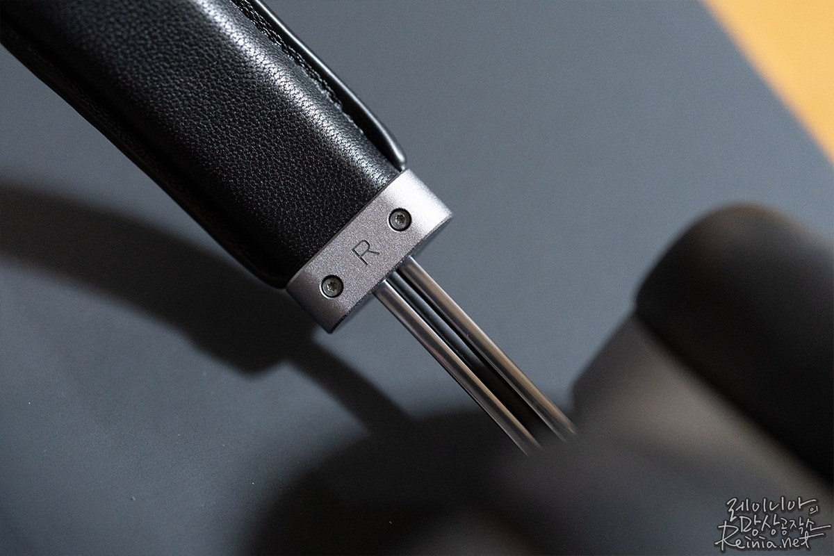 본체는 단단한 느낌의 스테인리스 스틸 재질이며, 피부와 맞닿은 부분은 가죽으로 마감 처리됐습니다. 헤어 밴드 부분은 외부가 소가죽, 내부가 양가죽이라고 하네요.