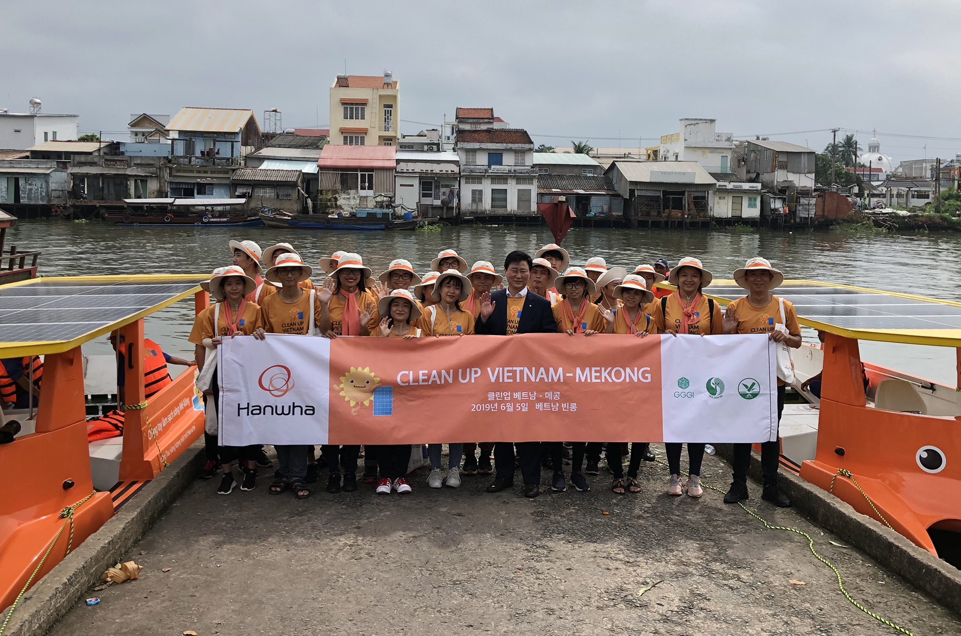 '클린업 메콩' 캠페인은 한화그룹의 글로벌 사업장 중 하나인 베트남 지역의 환경문제 해결을 위해 준비한 캠페인입니다. 한화그룹은 베트남 빈롱시에 한화큐셀의 태양광 패널로 작동하는 수상 쓰레기 수거 보트 2척을 기증했는데요.