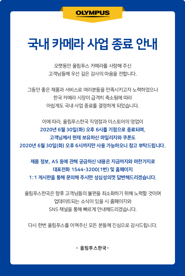 21일 올림푸스한국은 카메라 이스토어에 공지사항을 올리고 한국시장 철수를 공식적으로 밝혔습니다.