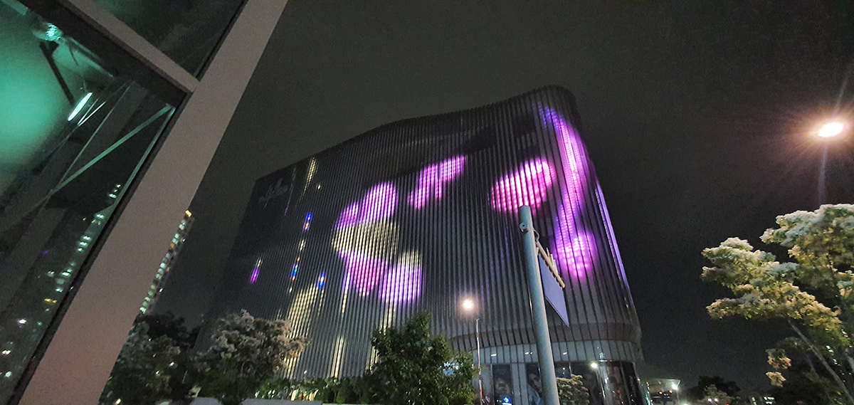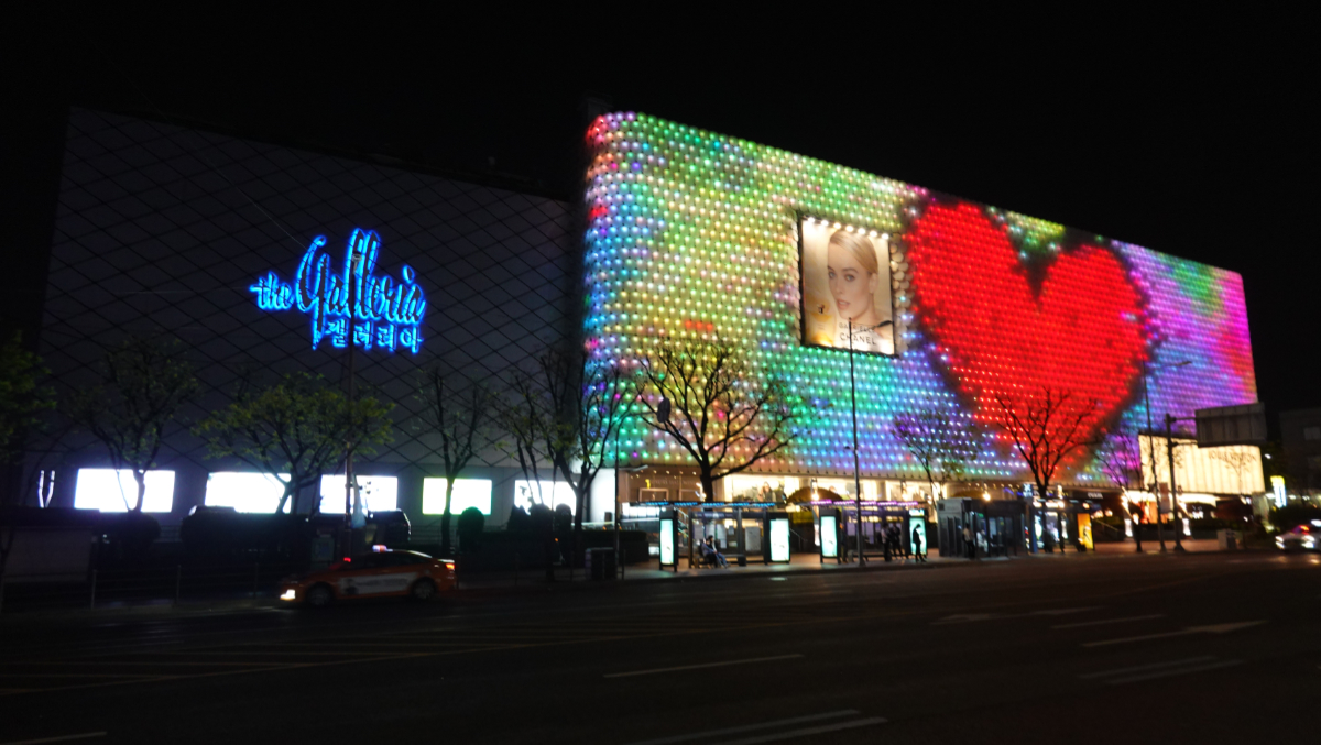 ‘라잇! 러브’(Right! LOVE) 릴레이 캠페인의 시작은 서울 압구정동 갤러리아 명품관에서부터 시작했는데요. 아시다시피 압구정 갤러리아 명품관 웨스트 건물 외벽에는 유리 디스크와 LED 조명이 있어 해가 진 저녁 시간에는 총천연색 조명을 볼 수 있습니다.
