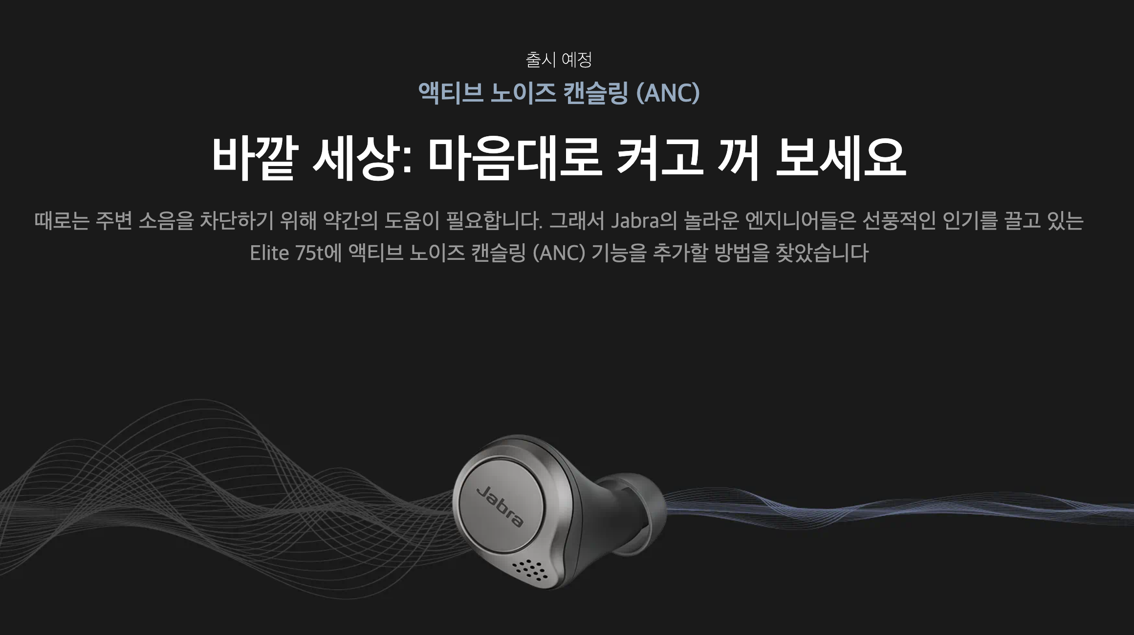 이번 업데이트는 스마트폰에 설치하는 Sound+ 앱을 통해 배포될 예정이며, 이후 출시될 자브라 엘리트 75t 라인에는 기본적으로 ANC가 적용될 예정이라고 합니다. 배포 시기는 약 10월 중순 쯤이 될 것 같네요.
