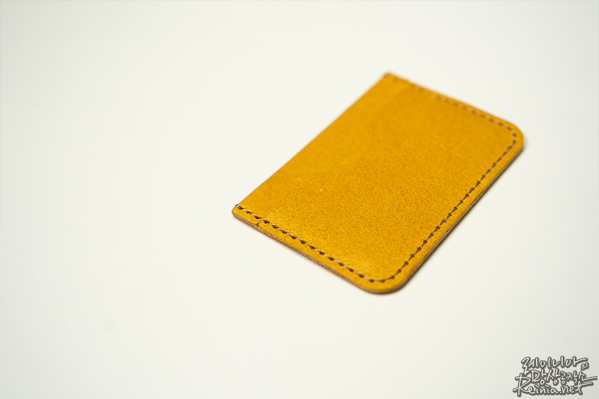 제 키트에는 약간 노란색 가죽과 갈색 실이 있어서 이를 바탕으로 카드 지갑을 만들었는데요. 어떤가요? 실제로 파는 것보다는 살짝 투박한 느낌은 있지만, 가죽의 품질 하나만큼은 어디가서도 뒤떨어지지 않는다는 생각이 드네요.