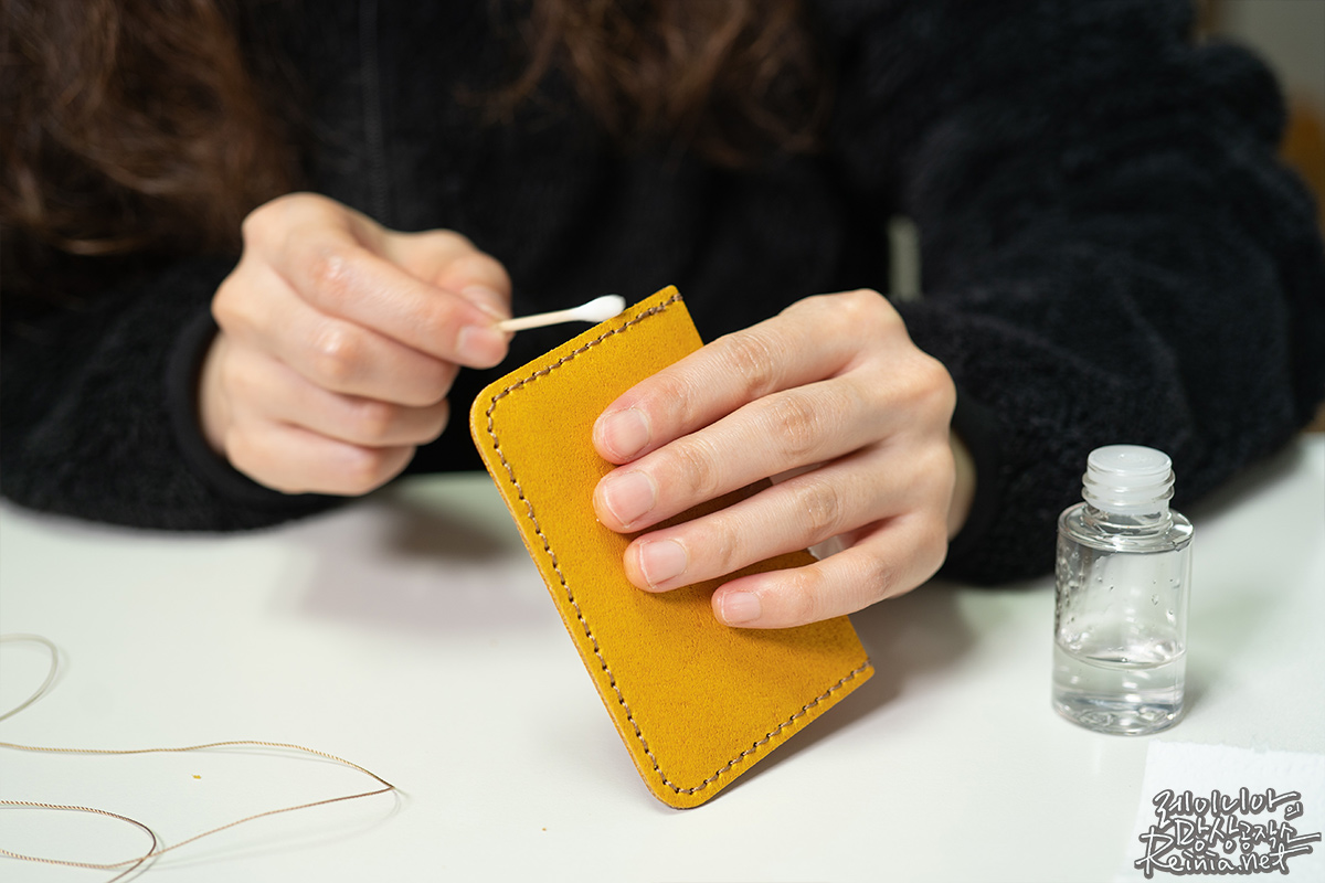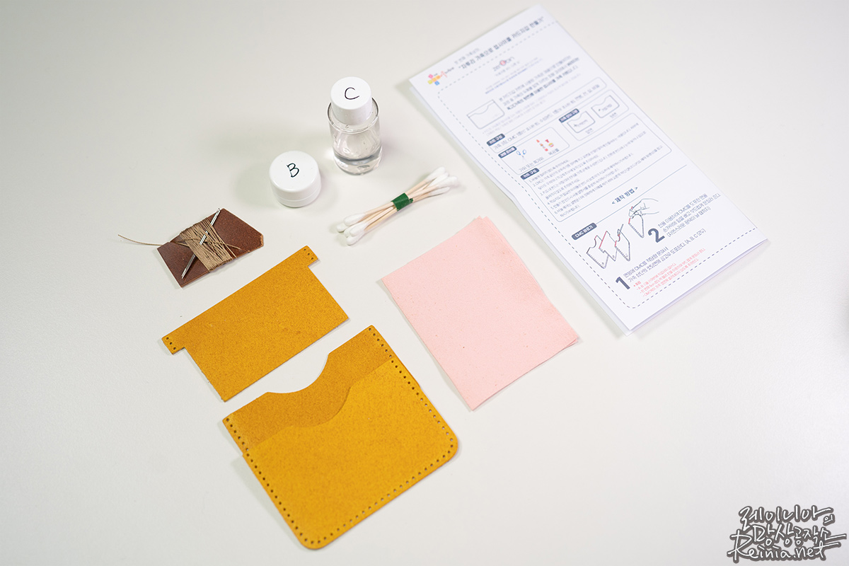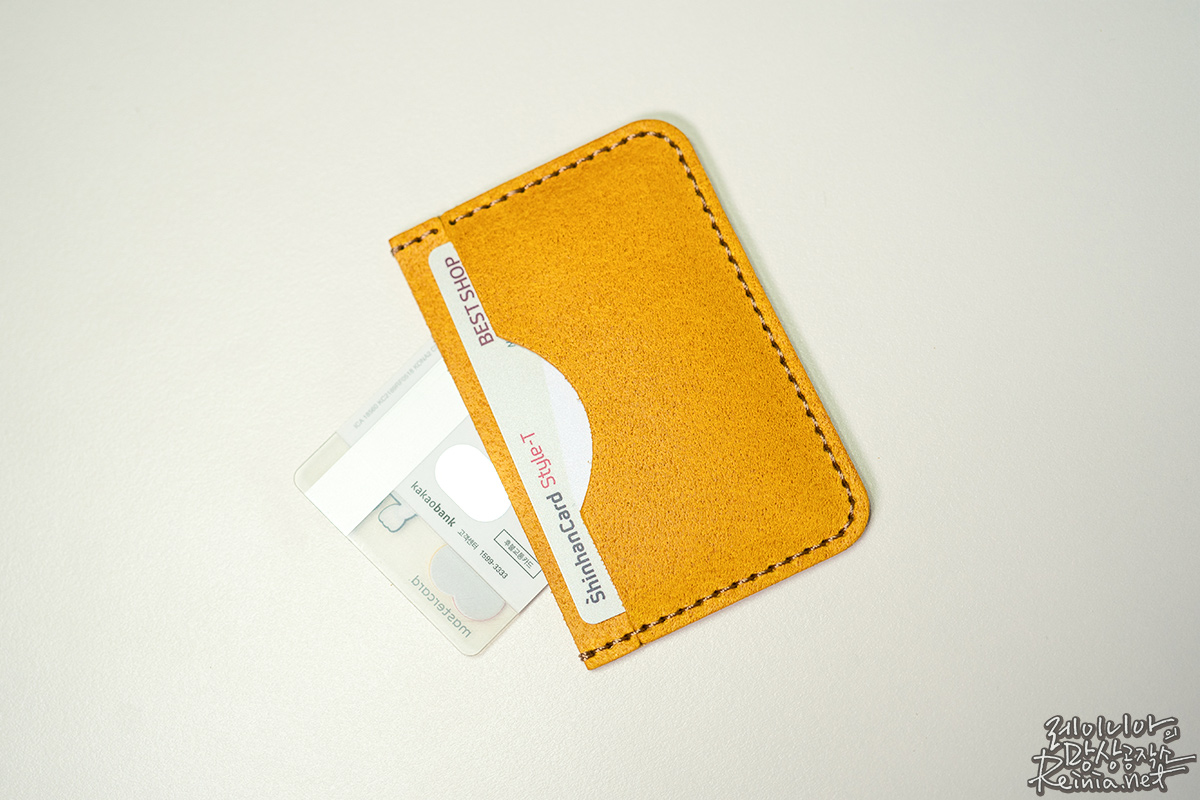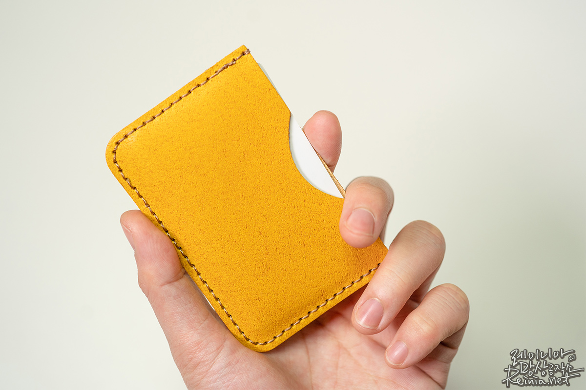 제 키트에는 약간 노란색 가죽과 갈색 실이 있어서 이를 바탕으로 카드 지갑을 만들었는데요. 어떤가요? 실제로 파는 것보다는 살짝 투박한 느낌은 있지만, 가죽의 품질 하나만큼은 어디가서도 뒤떨어지지 않는다는 생각이 드네요.
