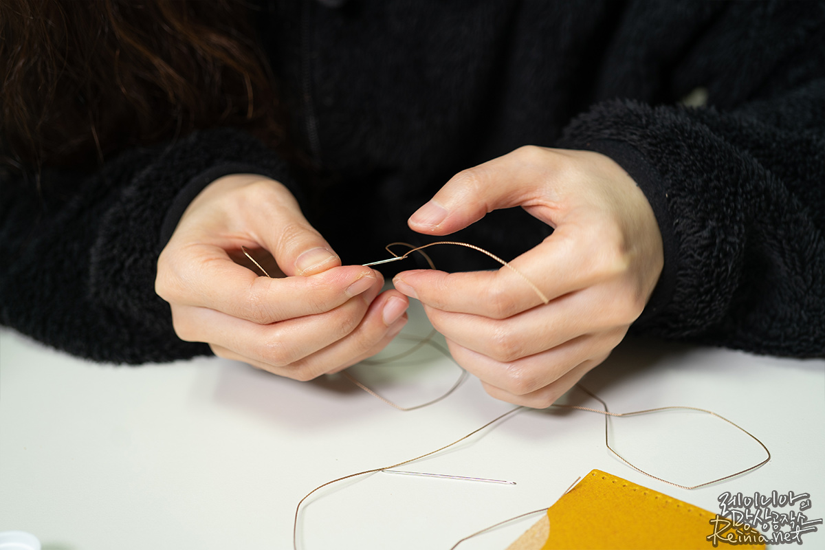 전체적인 제작과정이 어렵진 않았습니다. 제작 방법에 맞춰 하나씩 차근차근 진행하면 됐는데요. 실 꿰메는 부분이 조금 어려웠으나 동영상을 보면서 차근차근 따라하니 문제 없이 마무리할 수 있었습니다. 제가 비슷한 프로그램을 유료로 진행해본 적이 있었는데, 사실 가장 힘든 부분은 가죽을 재단하고 실을 꿰는 구멍을 뚫는 부분이더라고요. 이런 부분이 이미 완료된 가죽공예 키트라 힘들지 않게 마무리할 수 있었습니다.