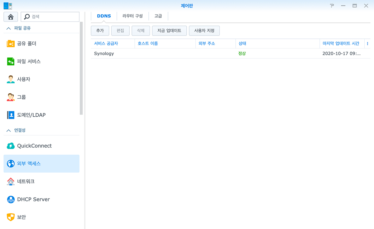 또한 외부 액세스 설정도 마무리를 해두는 게 좋습니다. 그냥 IP 대로 무식하게 들어가려고 했더니 자꾸 오류가 표시되더라고요. DDNS 설정을 통해 synology.me 도메인을 하나 받아두는 게 아무래도 편리합니다.