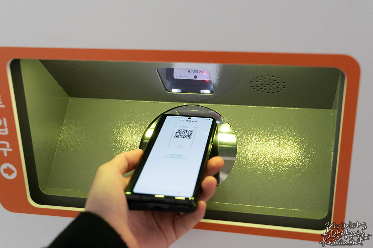 앱을 받고 회원가입까지 하면 기기를 활용할 준비가 모두 끝났습니다. 앱에서 '배출하기' 버튼을 누르면 화면에 QR 코드가 표시되는데요. 이 화면을 기기 밑에 있는 스캐너 부분에 가져가면 기기가 QR 코드를 통해 회원을 인식하고 수거할 준비를 합니다.