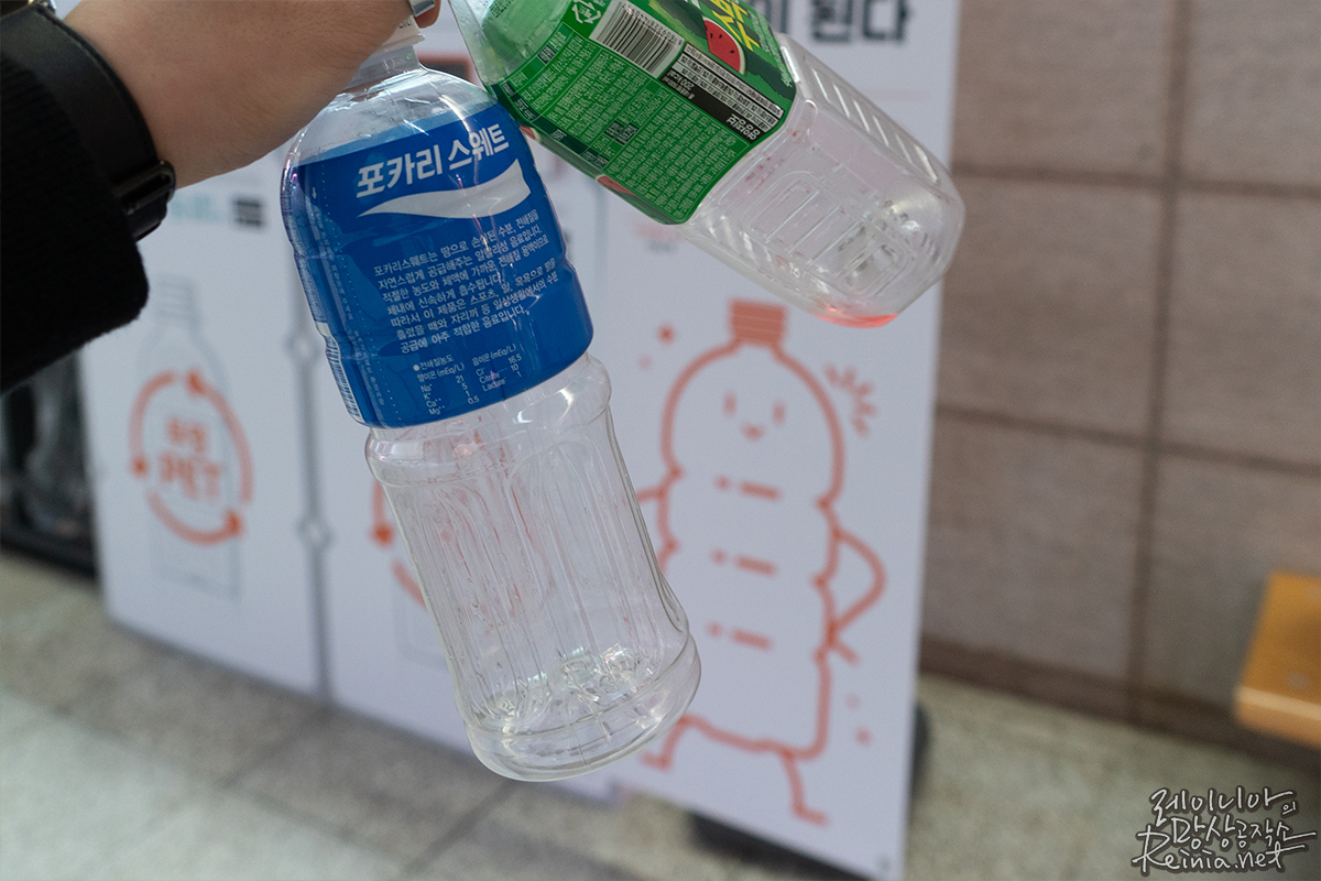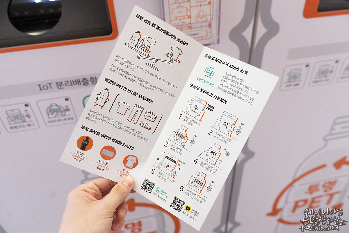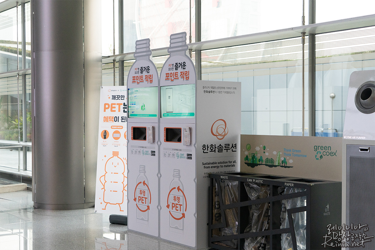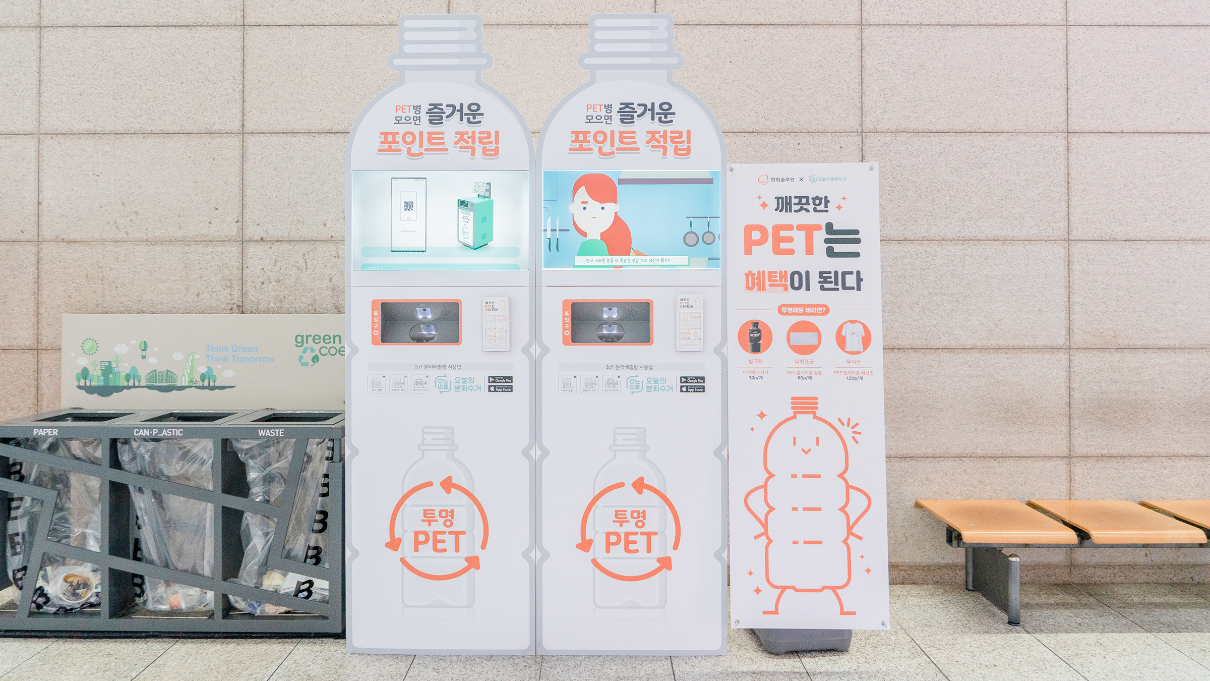 친환경 스타트업인 오이스터에이블은 재활용 IoT 기기를 제작하고 있습니다. '오늘의 분리수거'라는 앱과 재활용품 수거 기기는 재활용품을 내면 일정한 리워드를 사용자에게 제공해 분리 수거율을 높이고 참여를 독려하는 형태의 사업을 전개하고 있는데요. 여기에 한화솔루션이 컬래버레이션을 통해 '깨끗한 PET는 혜택이 된다!'는 이름으로 페트병을 수집하는 기기를 코엑스에 설치했습니다.