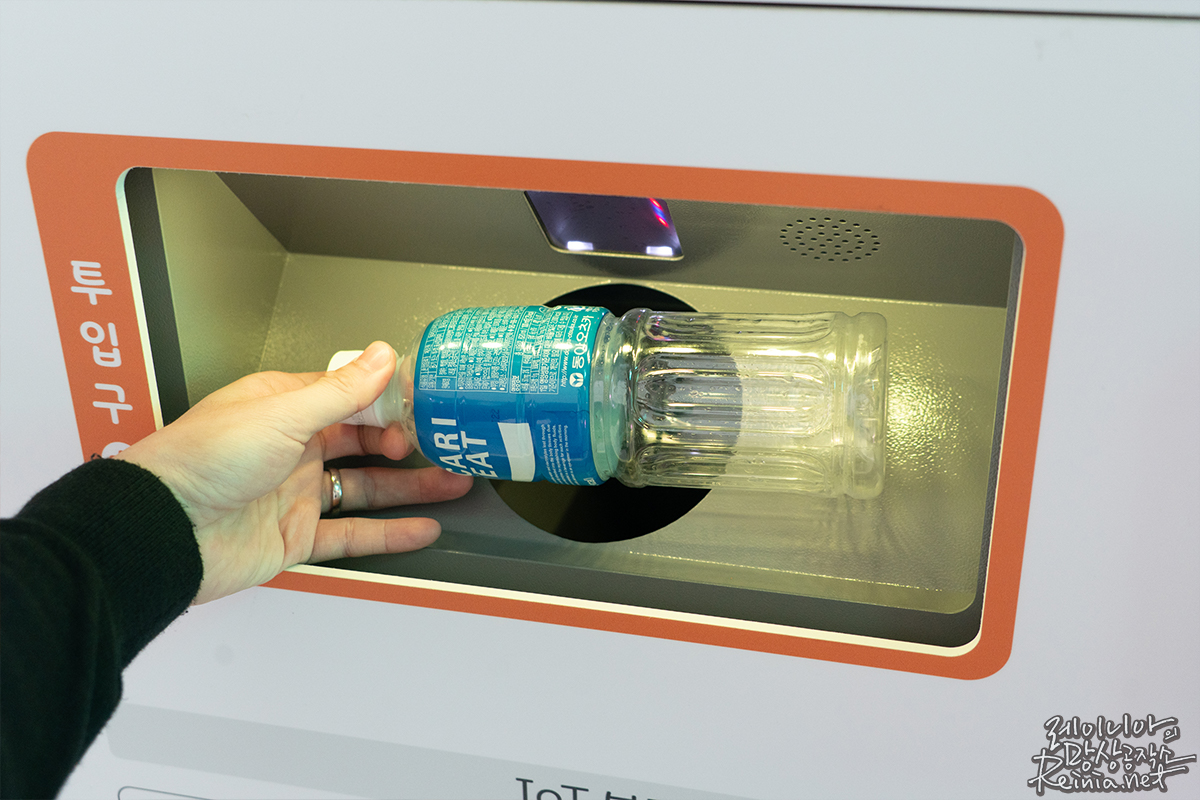 아래 수거함이 열리는데요. 그 자리에서 바로 페트병을 넣는 게 아니라 이번에는 제품의 바코드를 스캐너에 가져가 인식시켜줍니다. 그러면 인식이 완료됐다는 소리가 표시되고, 수거함에 페트병을 집어넣으면 됩니다. 한 번에 여러 개를 인식할 수 있고요. 각각 바코드를 인식해 넣고 나면 수 초가 지난 후 자동으로 수거함 문이 닫히며 적립이 완료됩니다.