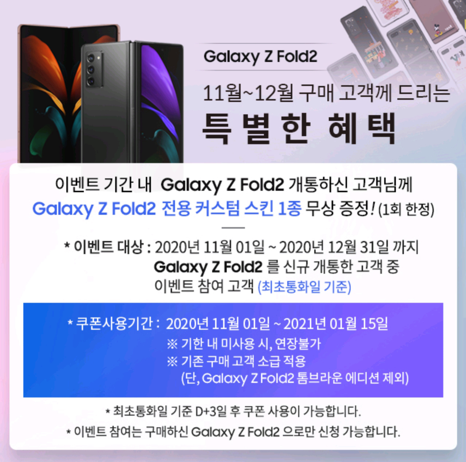 삼성전자에서 자사의 Z시리즈(갤럭시 Z 플립, 갤럭시 Z 폴드2) 구매자를 대상으로 커스텀 스킨 1매를 무료로 제공한다는 소식입니다.