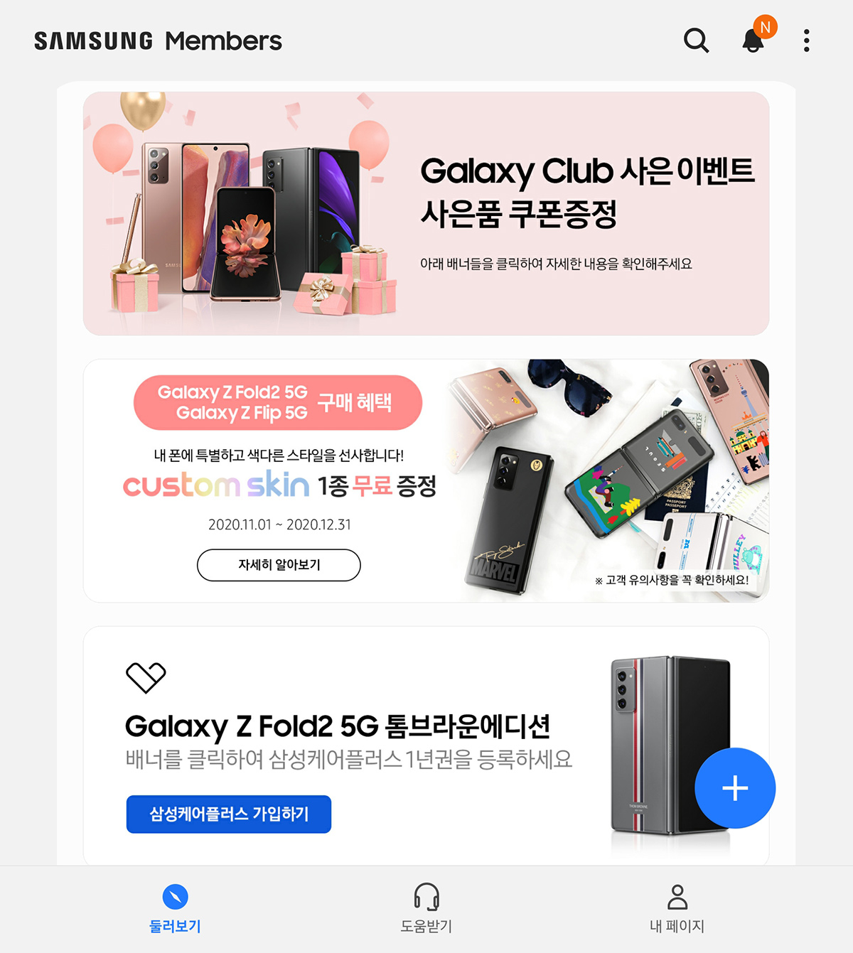 신청하는 방법은 간단합니다. 대상 기기에 기본 탑재된 '삼성 멤버스' 앱에 들어가면 메인 페이지에서 신청할 수 있습니다. 다른 기기에서 지원하지 않으니 꼭 대상 기기로 직접 들어가야 합니다.