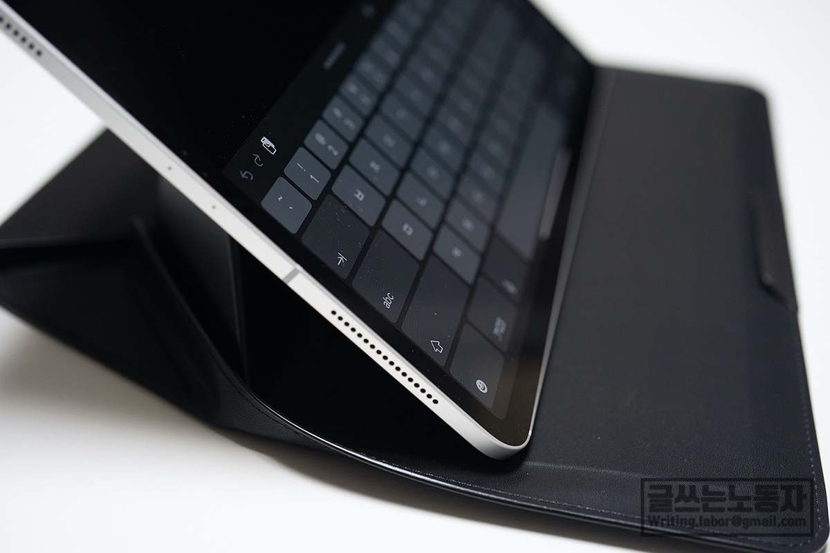 그래서 가로 사용과 세로 사용을 모두 고려하다 보니 모프트 X 태블릿 스탠드의 위치는 조금 어정쩡한 위치에 있게 됐고, 이는 가로와 세로 모두에서 불편한 상황을 연출하곤 했다. 10.5인치 전후의 기기라면 그럭저럭 쓸 만할지도 모르나, 12.9인치에서 쓰기엔 그 지지력이 아쉽다.