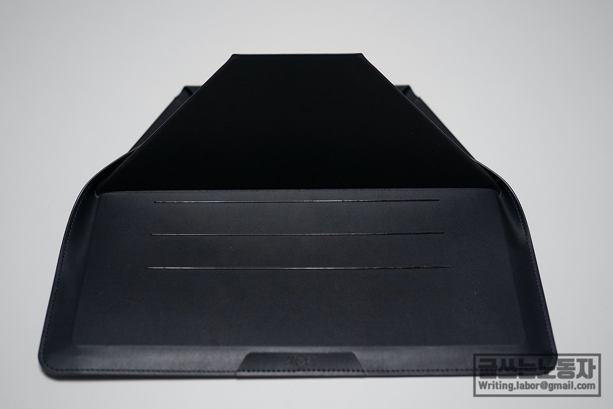 슬리브의 구조도 간단하다. 합성 가죽인 PU 가죽으로 이뤄진 슬리브의 한쪽 면에는 고무 패킹이 있고, 반대쪽에는 조금 뜬금없다 싶은 부들부들한 부분이 있다. 입구 부분의 자석 뚜껑을 젖히면 슬리브 내부가 보인다. 부들부들한 면에는 얇은 경계가 있어 이 부분을 젖혀 태블릿 외 다른 물건을 넣을 수 있다.