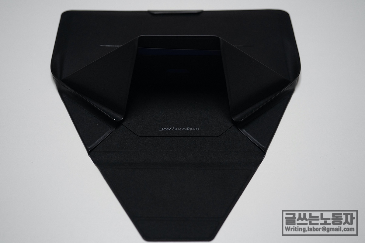 그래서 가로 사용과 세로 사용을 모두 고려하다 보니 모프트 X 태블릿 스탠드의 위치는 조금 어정쩡한 위치에 있게 됐고, 이는 가로와 세로 모두에서 불편한 상황을 연출하곤 했다. 10.5인치 전후의 기기라면 그럭저럭 쓸 만할지도 모르나, 12.9인치에서 쓰기엔 그 지지력이 아쉽다.
