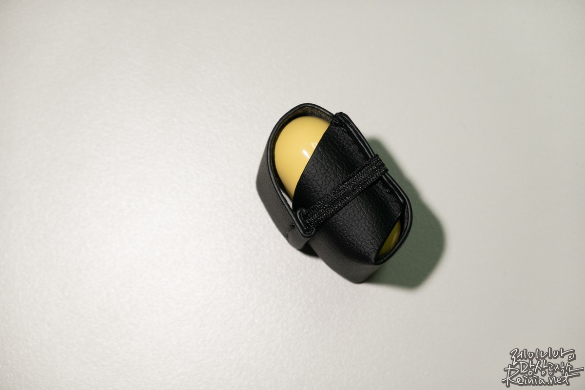 또한, 이탈리아 사과 껍질로 제작한 친환경 가죽으로 제작한 이어폰 케이스를 함께 제공합니다. 저는 케이스를 받아봤습니다. 똑딱이와 같은 다른 고정틀 없이 밴드로 고정하는 형태의 케이스로, 가죽 자체는 기대 이상으로 가죽 느낌이었습니다. 다만, 고무 밴드로 고정하는 방식이니 만큼 기대 수명이 명확하고, 그 고무 밴드가 그리 튼튼해 보이지 않아 보이는 점은 아쉬운 점입니다. 케이스는 끼운 상태에서 충전하기가 어려운 점도 아쉽네요.