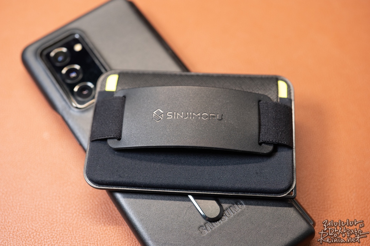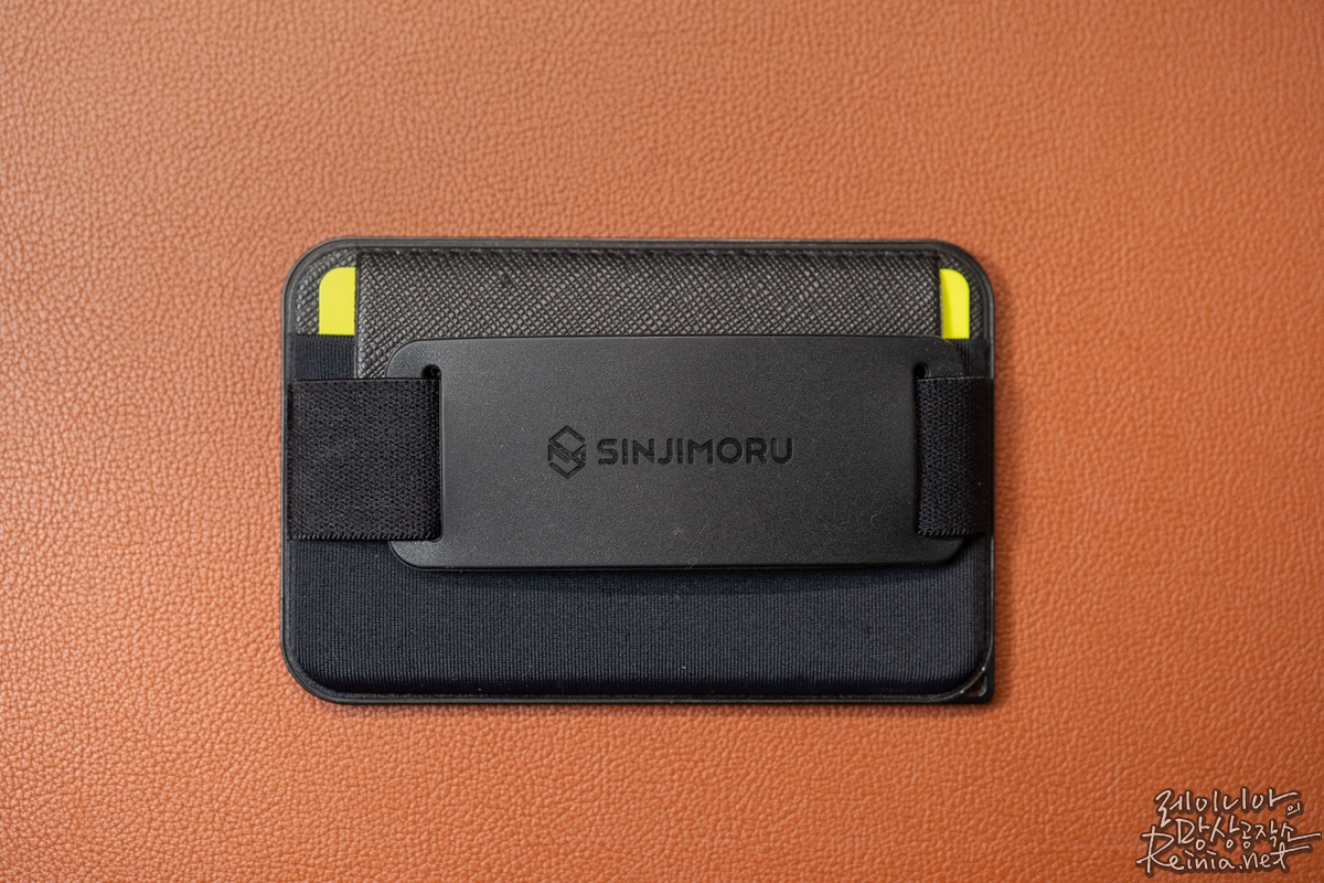 뒷면에는 카드를 넣을 수 있는 공간이 부드러운 천으로 감싸져 있으며, 합성 가죽 커버가 그 위에 있습니다. 그리고 신지모루 맥세이프 M-밴드그립 전체를 아우르는 고무 밴드가 있고, 무게감과 함께 스마트폰을 잡을 때 도움이 되는 실리콘 그립이 함께 있습니다.