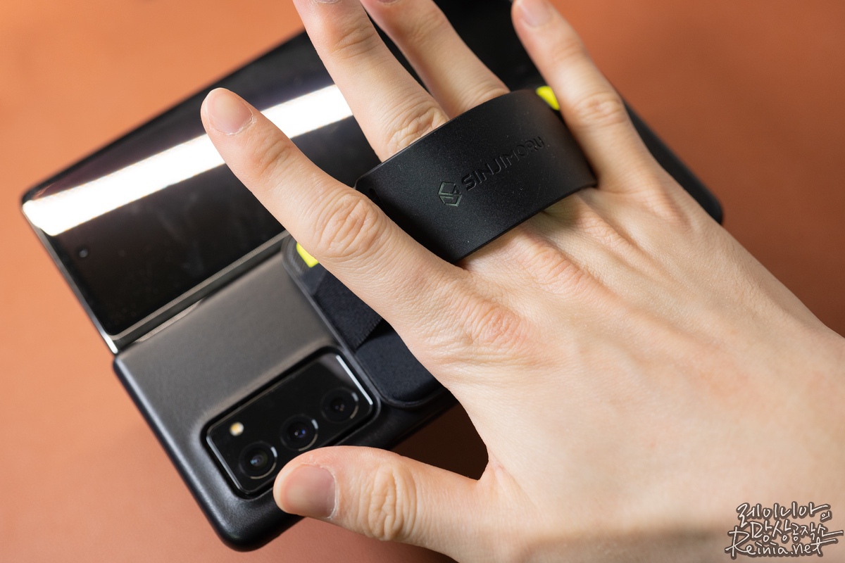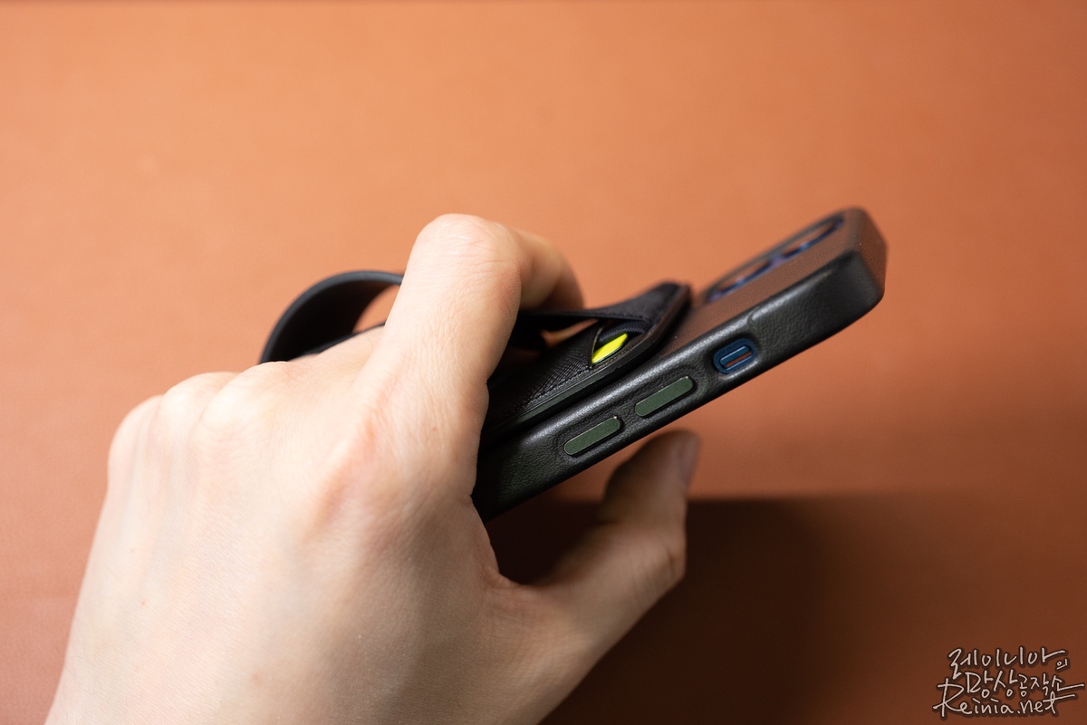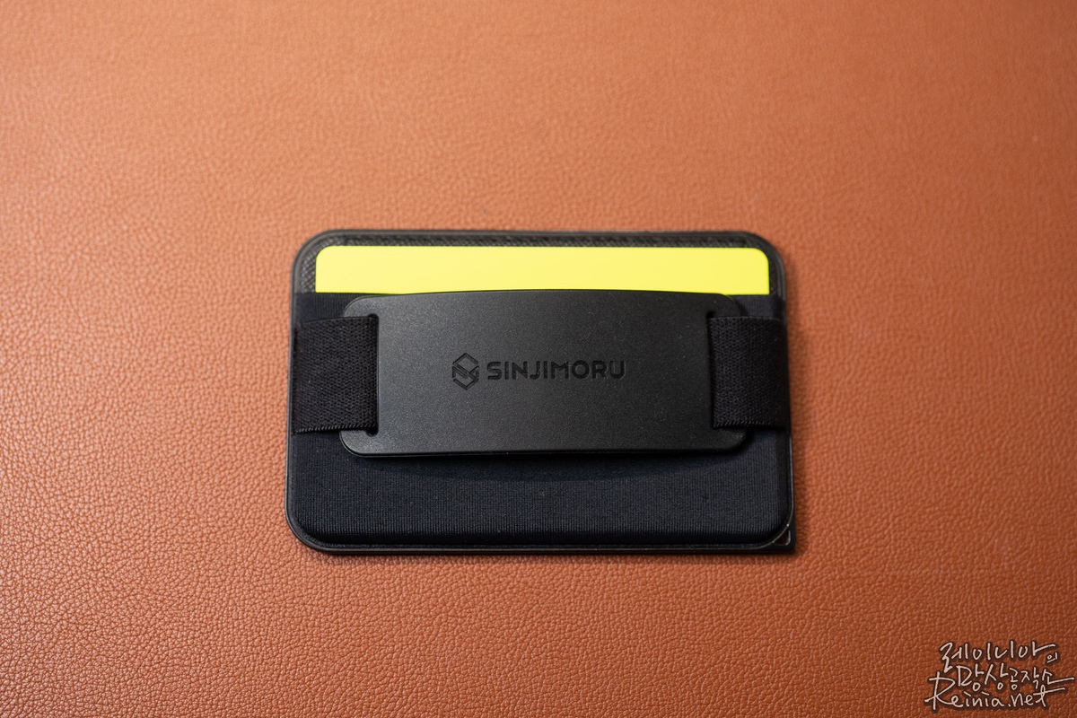 뒷면에는 카드를 넣을 수 있는 공간이 부드러운 천으로 감싸져 있으며, 합성 가죽 커버가 그 위에 있습니다. 그리고 신지모루 맥세이프 M-밴드그립 전체를 아우르는 고무 밴드가 있고, 무게감과 함께 스마트폰을 잡을 때 도움이 되는 실리콘 그립이 함께 있습니다.