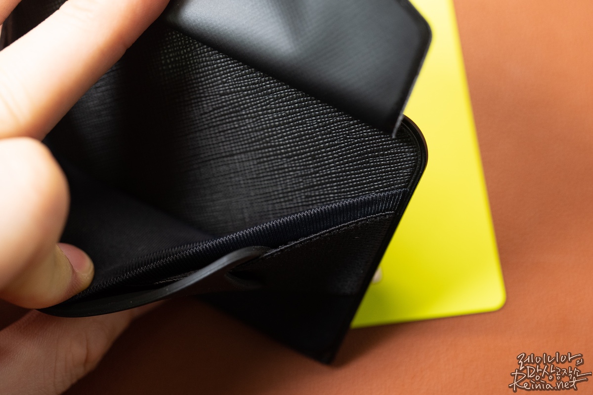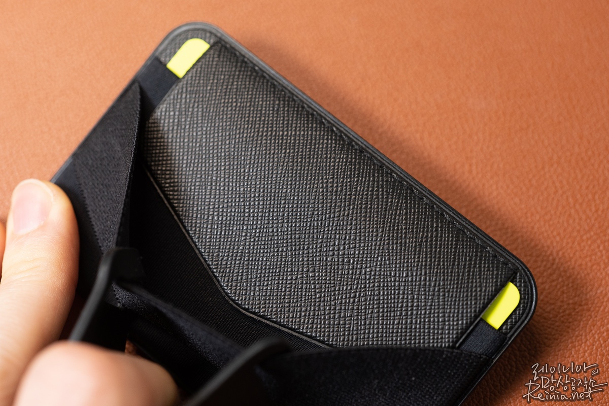 외관에서 고급스러움이 느껴지지는 않으나, 그렇다고 저렴한 티가 느껴지는 것도 아닙니다. 실제로 촉감을 살펴보면 카드 수납공간과 밴드의 유연성 때문에 부드러운 느낌이고, 동시에 '아주 튼튼하진 않겠다.'하는 생각이 듭니다.