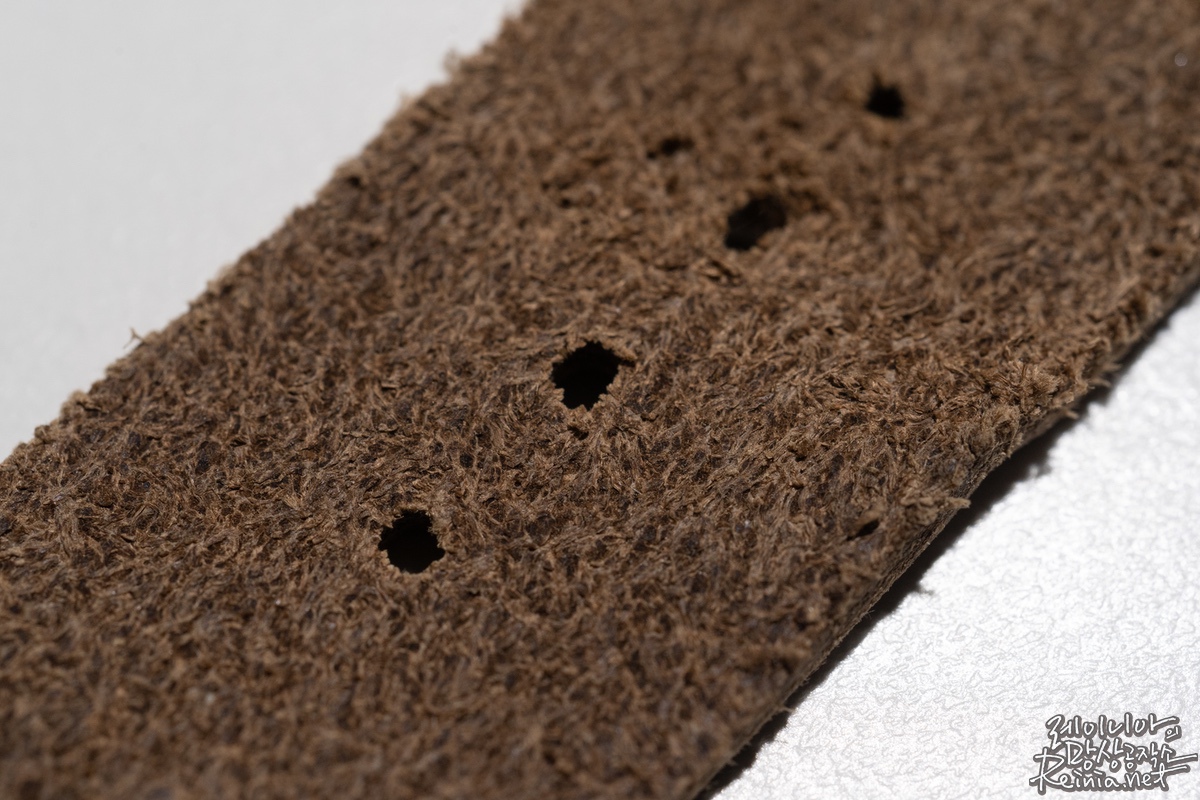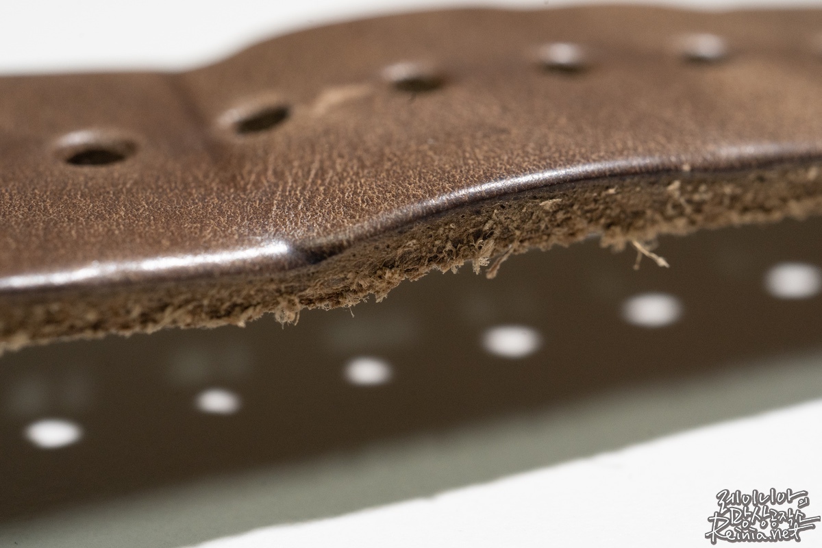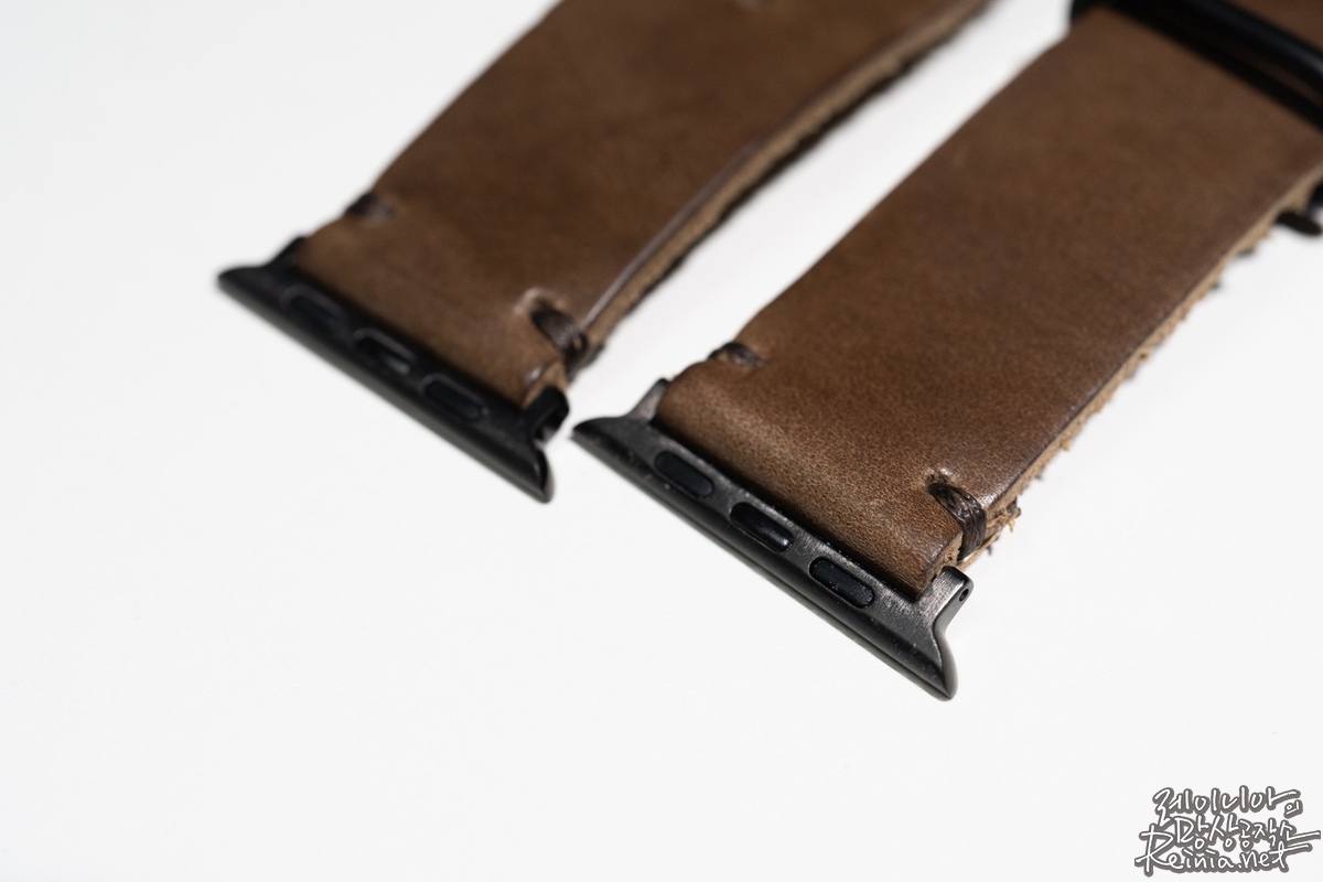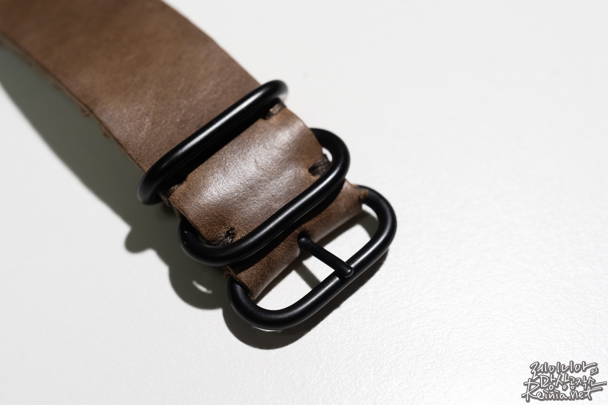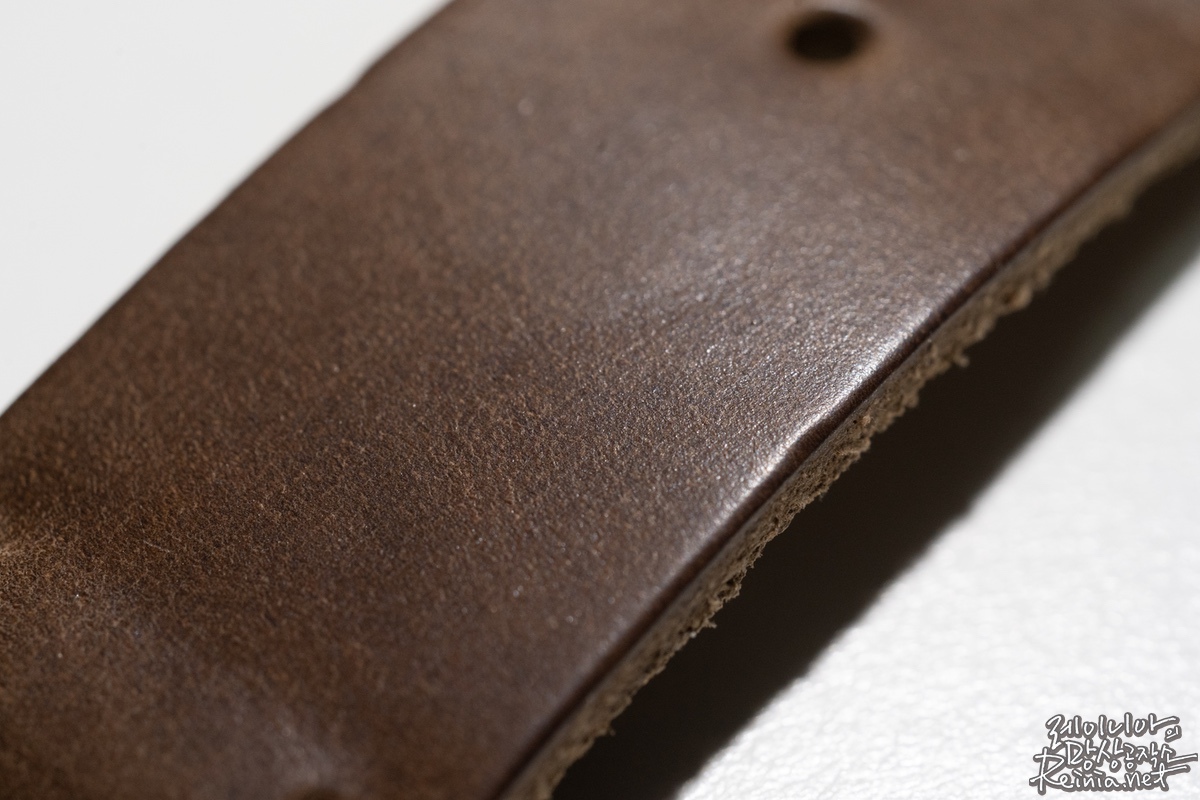 생각했던 것보다 스트랩이 두꺼운 느낌입니다. 이래서 풀그레인 가죽이라고 하는건가 싶었는데요. 두께감은 있지만 질감이 부드럽고요. 표면의 촉감 또한 매끄럽습니다. 색상은 다소 어두운 회갈색입니다. 사진에서 보는 바와 크게 차이나진 않습니다. 다만, 가죽의 특성상 제품별 다소 차이가 있을 순 있습니다. 특히 풀그레인 가죽은 모공이나 가죽 표면의 흉터 등까지 그대로 남아있어 모든 제품이 독특한 무늬를 갖고 있다고 합니다. 실제로 받은 스트랩들이 조금씩 차이는 있었습니다.