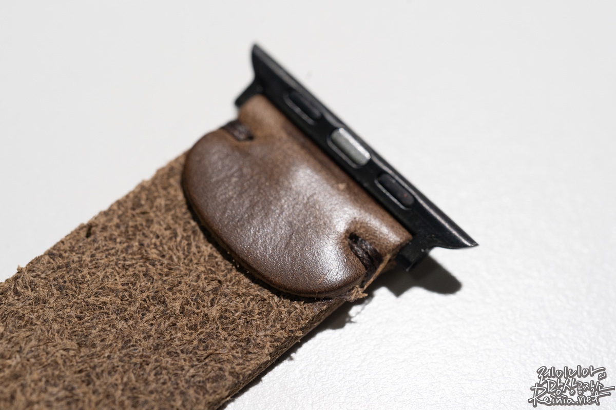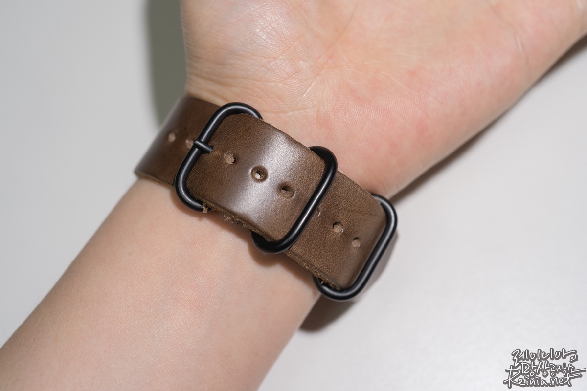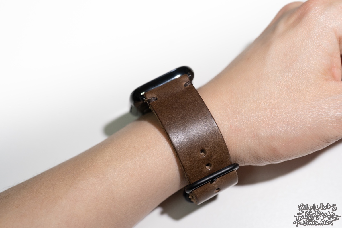 다른 서드파티 애플워치 스트랩과 다르지 않은 구조입니다. 스트랩을 고정하는 메탈 링이 세 개가 있다는 점이 조금은 독특한 점입니다. 제가 손목이 두꺼운 편은 아니라서 혹시 구멍이 너무 적게 뚫리진 않을까 걱정했는데, 제 기준으로는 세 번째 링을 채울 수 있을 정도로 촘촘하게 타공돼 있습니다. 착용하다 보면 가죽이 살짝 늘어날 것으로 예상해 무리하지 않고 채웠습니다.
