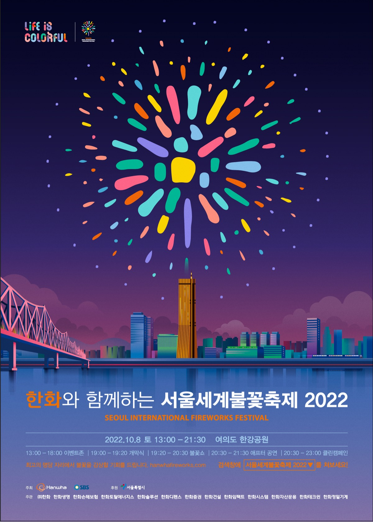 그랬던 불꽃축제가 3년 만에 ‘We Hope Again’이라는 슬로건과 함께 돌아왔습니다. 한화와 함게하는 서울세계불꽃축제 2022가 오는 10월 8일(토)에 진행 예정이라고 합니다.