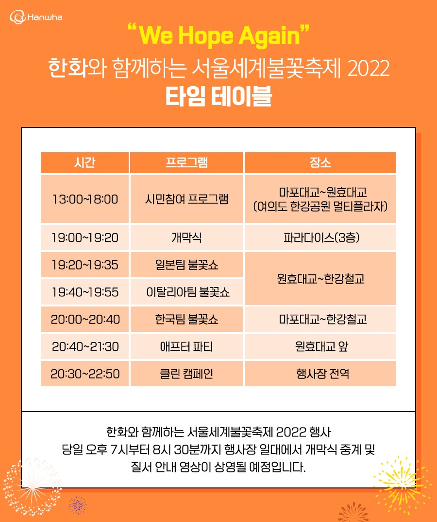 참고) 한화와 함께하는 서울세계불꽃축제 2022 ‘We Hope Again’ 타임테이블