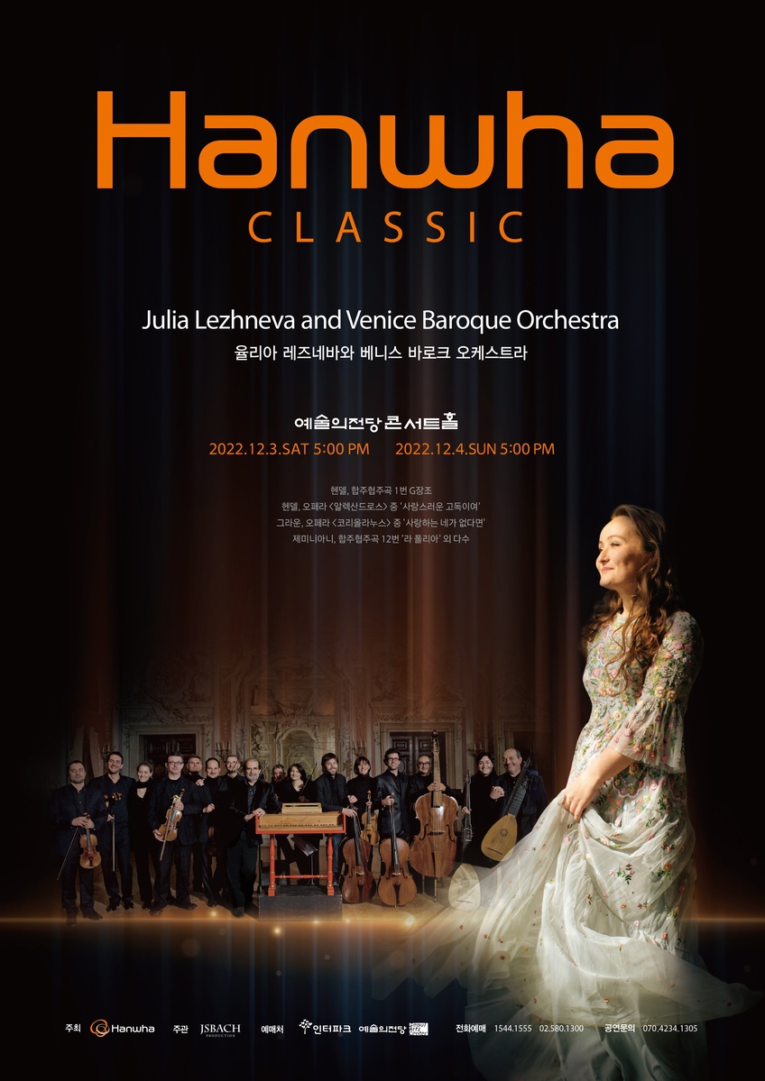 한화클래식은 바로크 음악의 매력을 널리 알리기 위한 공연을 이어왔는데요. 코로나19가 맹위를 펼쳐 해외 아티스트 내한이 어려웠던 지난 2020년에는 소프라노 임선혜와 함께 한화 바로크 프로젝트를, 2021년에는 소프라노 서예리와 한화 바로크 프로젝트를 진행했습니다. 그리고 비로소 이번 한화클래식 2022에서는 세계적인 소프라노 율리아 레즈네바와 베니스 바로크 오케스트라가 내한해 바로크 성악의 세계를 펼친다고 합니다.