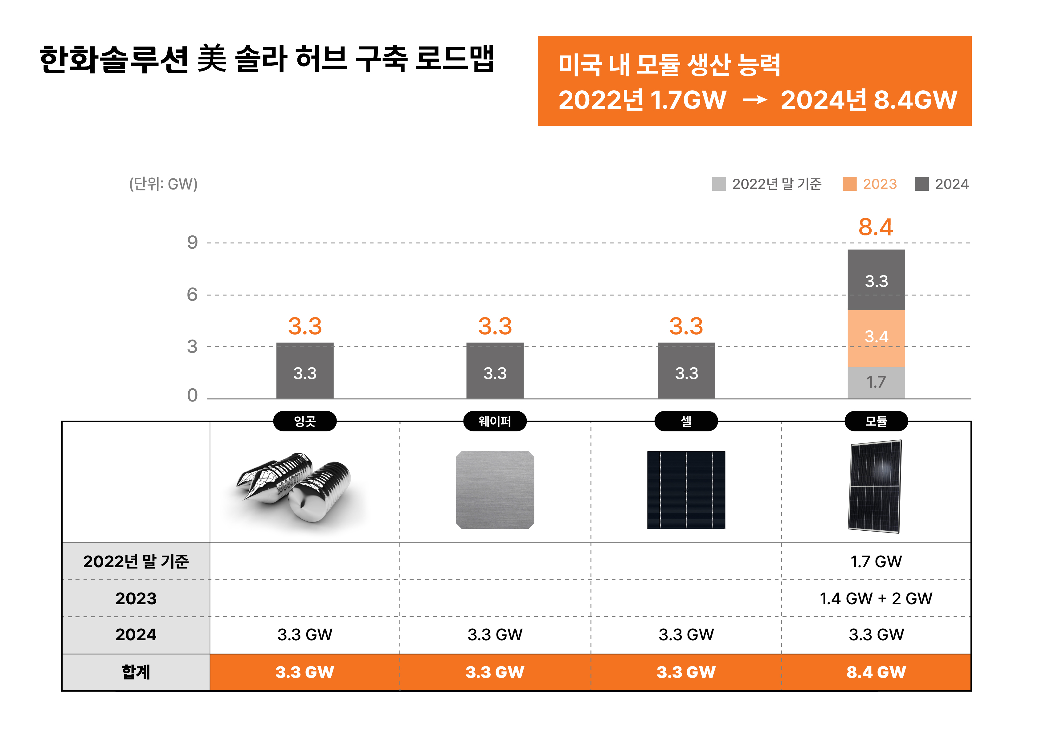 한화솔루션은 미국 조지아주에 3조 2천억원을 투자해 잉곳, 웨이퍼, 셀, 모듈 생산 단지를 건설할 예정입니다. 기존 모듈 공장이 있는 조지아 주 달튼 공장 근처인 카터스빌 근처에 걸설될 예정이며, 모든 시설이 완공되면 한화솔루션은 북미 지역에 태양광 핵심 밸류체인별 생산 라인을 모두 갖춘 유일한 기업으로 거듭나게 됩니다. 한화솔루션은 이번 투자를 통해 연간 1조원 규모의 세액 공제 혜택을 받게 될 예정이며, 10년간 7조 7천억원에 달할 전망이라는 전망입니다.