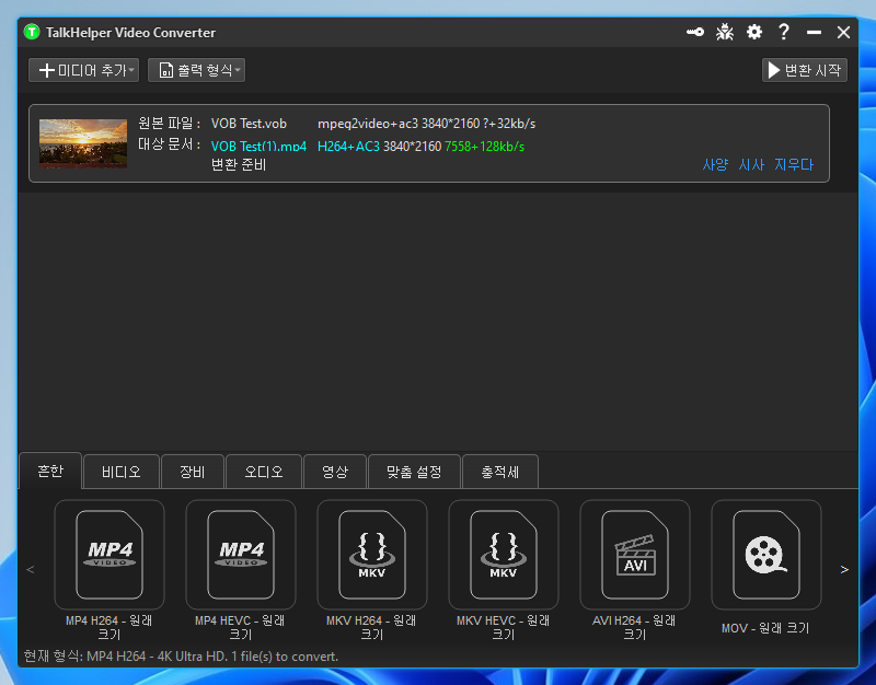 TalkHelper Video Converter provides an easy way to convert videos to MP4, MKV, AVI, MOV, WMV, and 1000+ more formats for free on Windows