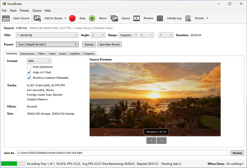 오픈소스 동영상 인코딩 프로그램인 핸드브레이크를 활용할 수도 있습니다. 핸드브레이크는 DVD 추출에 특화된 프랑스 소프트웨어입니다. 윈도우, 맥 모두를 지원하지만 저는 맥을 쓸 때 종종 활용했던 것 같네요. 꽤 오래 전부터 비슷한 UI를 활용하고 있으며, 개인적으로는 살짝 산만하다고 생각합니다. 이것저것 뒤지면 원하는 목적(VOB 파일을 MP4 파일로 변환)하는 것은 설정할 수 있고요. 다만 하드웨어 가속을 지원하지 않아서 변환하는 데 거의 1분 20초 가까이 걸린 것 같고, 컴퓨터가 이륙하듯 어마어마한 팬소음이 발생했습니다. 아마 긴 영상이라면 다른 작업에 영향을 끼칠 정도로 리소스를 가져갈 것 같네요. 하지만 무료니까요....