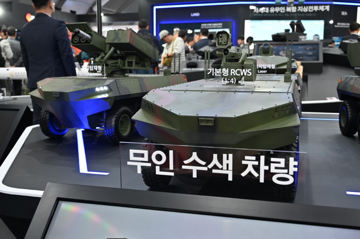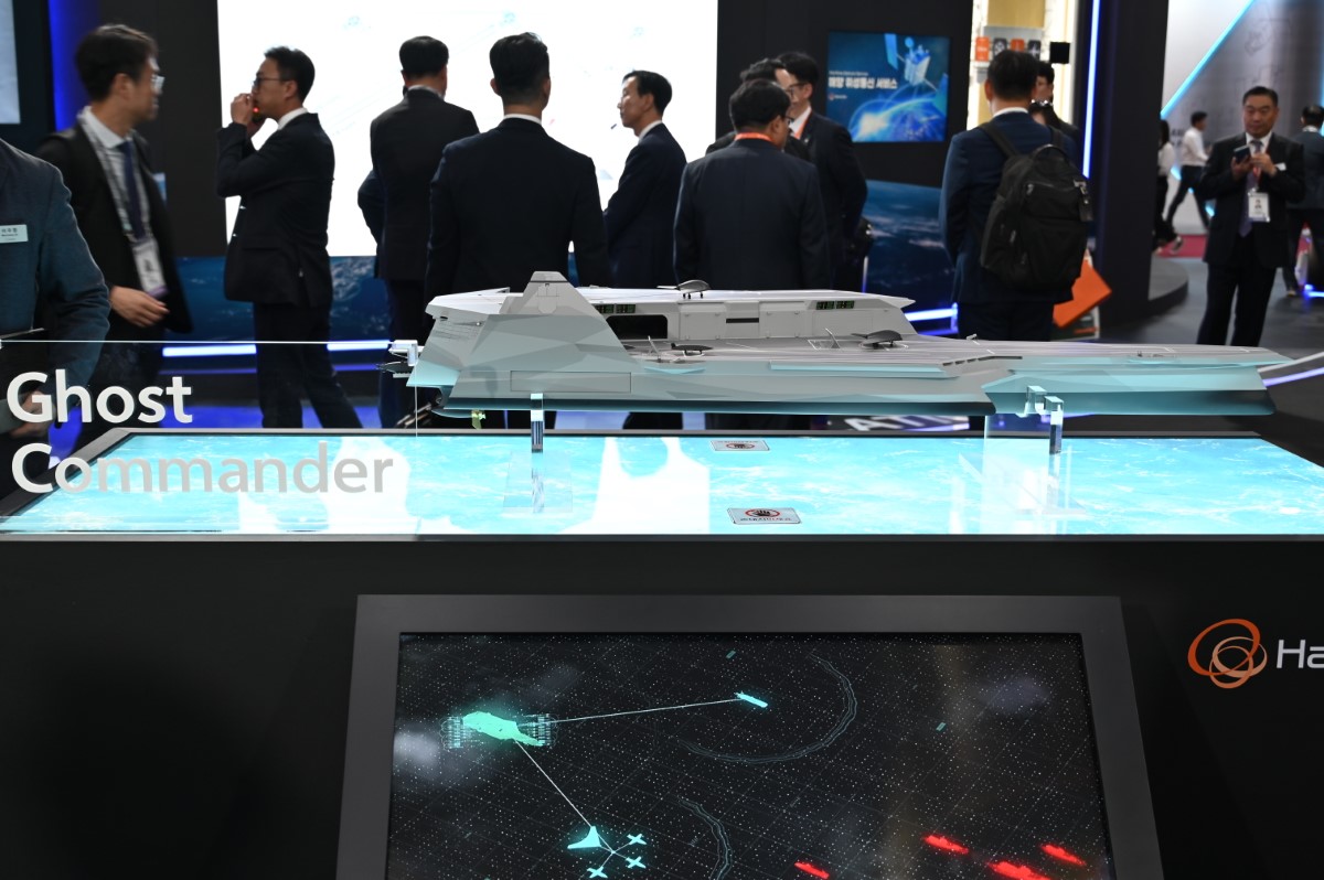 육해공 포트폴리오 외에도 주목할 만한 요소는 '무인화' 솔루션입니다. 사람의 생명을 보호하기 위해 방위산업뿐만 아니라 다양한 산업에서 무인화 솔루션은 이미 대세로 떠오르고 있죠. 한화그룹에서도 한화에어로스페이스가 개발해 올해 12월 미 해병대 테스트를 앞둔 차세대 군용무인차량 아리온스멧(Arion-SMET)이 전시됐습니다. 한화오션에서도 '고스트 커맨더'로 불리는 무인전력지휘통제함 시스템을 공개했습니다.