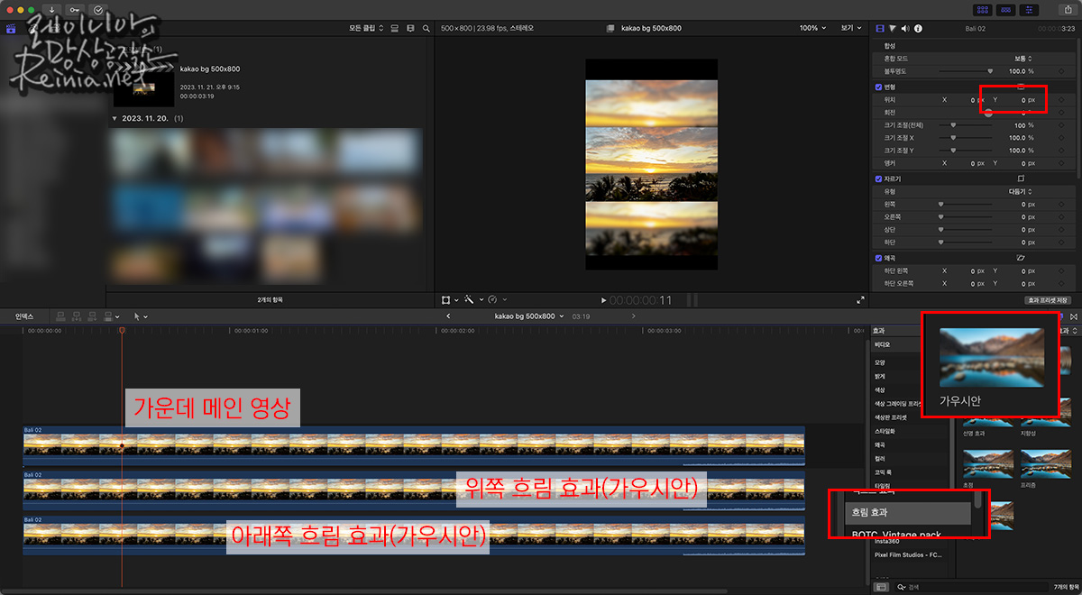 이후 화면 효과에서 흐림 효과-가우시안 흐림 효과를 찾아서 입혀주면, 뿌연 블러(Blur) 처리가 되는 배경이 완성됩니다. 물론, 전체 영상을 활용하지 않고 마스크 등을 이용해 영상의 일부분만 확인하는 것도 한 가지 방법이 되겠습니다.